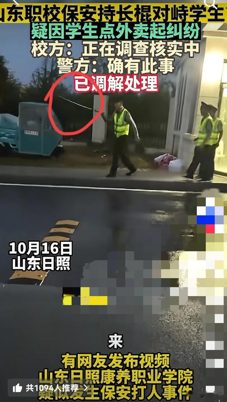 第一次见识啊,学校保安不保护在校学生了,持着棍子驱赶学生啊。这爆脾气的保安大叔,学校领导是准备升职加薪呢,还是开除呢? 山东某职业学校,疑似又是因为学生点外卖的纠纷,导致保安这次直接和学生之间发生冲动。 一保安和一在校学生对骂不解气,还掏出一根长棍,冲上前去,直接对着学生甩出去,家长纷纷怒言,“这里是缅甸,还是学校?” 是啊,谁给保安打学生的权利,请站出来走俩步,送孩子去读书,点个外卖,就被攻击到棍棒“伺候”了?这么大的权利,你领导知道吗? 最后的结果,是派出所已出面协调,一句处理好结束。但是实质的问题又根本结决了吗?后续会不会继续发生保安打学生的情况呢?一切都是未知数啊。 (图片来自网络视频)