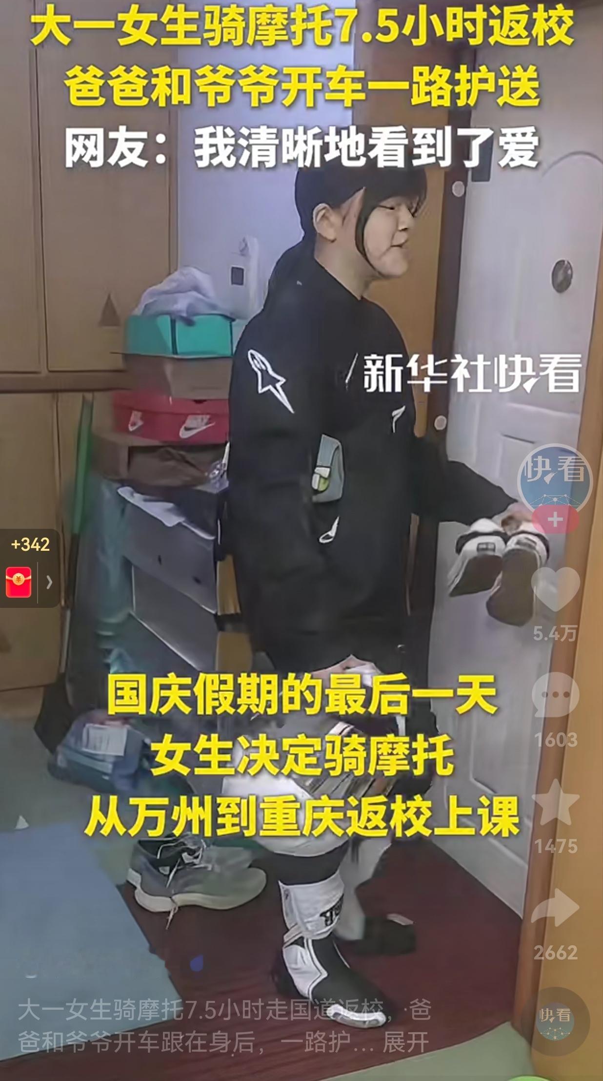 父爱无声,却震耳欲聋!国庆假期结束,大一女生决定骑摩托车从万达到重庆返校上课,女生把这一决定告诉爸爸后,爸爸不仅没有明确拒绝孩子,而是支持了她这一决定。 在返校的前一天,爸爸和女儿制定骑行路线。最终,一致决定走国道,因为重庆高速禁摩。 但是呢?一个女孩子骑摩托车返校不太安全,出于安全考虑,因此,爸爸和爷爷开车跟在后面一路“保驾护航”。 据爸爸透露,孩子今年19岁,8月份才取得驾驶证,孩子特别喜欢骑行,这是她的爱好,作为家长不应该剥夺孩子的兴趣爱好,而应该给孩子更多的支持和保护。所以,这次女儿选择骑行上学,我没有反对,我开车陪护女儿上学,也只是做了一个父亲该做的基本工作。 最后,经过7.5小时的骑行,女生安全抵达学校。 网友看到后评论说,我相信女生不管今后遇到什么困难,想起今天的事情,都会觉得没有迈不过去的阚。 还有的网友说,家长太溺爱孩子了,有一次就有第二次,太危险了,长大了如果依旧任性,就需要自己为自己的行为买单。 要我说,孩子已经19岁了,是一个成年人了,她应该为自己的行为负责任了。 而且,这是孩子的兴趣爱好,又不是什么坏事。作为家长一定要全力支持孩子的兴趣爱好,不能动不动就打压孩子用家长的态度,对孩子说,这也不行,那也不行!这也不能干,那也不能干! 如果你这样教育孩子,等孩子长大了,你会发现孩子的兴趣就被扼杀在摇篮里了! 大家觉得呢?欢迎大家评论区讨论留言。