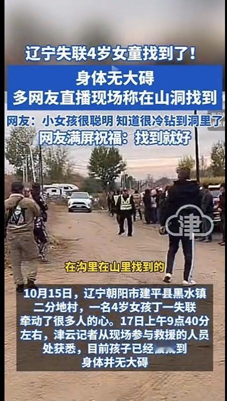真的是天大的好消息!10月15日辽宁朝阳市建平县黑水镇二分地村,爷爷开着面包车带着孩子下地干活,孩子今年四岁,当时女孩睡着了,爷爷奶奶就把小孙女放到了面包车上睡觉。而爷爷奶奶就在地里干活,两者相距200米,可能爷爷奶奶忙于干活,来不及一直查看面包车的情况。 20分钟后,当奶奶察看小孙女是否睡醒,这个时候却发现小孙女不见了。当时面包车的窗户被打开了,但是门车门是关着的。有可能是孩子自己爬窗户离开的。 爷爷奶奶寻找了一大圈,没有找到小孙女的身影,心急如焚。因此,拨打了报警电话,也联系了孩子的父母,赶紧回来寻找。 父亲回来之后,一直在家附近贴寻人启事。 接警后,公安机关立即出警,联合消防救援、应急、医疗、乡镇党委政府、村民以及蓝天救援队等社会力量救援,围绕走失地开展搜救。 经过各方的不懈努力,失踪44小时的小女孩丁一于10月17日9时30分许被找到。 据网友透露,孩子是被无人机找到的,小女孩很聪明,知道下雨天天气寒冷钻到洞里了。 令人欣喜的是,孩子被搜救出来的那一刻,生命特征平稳,还能正常对话,目前孩子已经送医。 网友看到后评论说,看到孩子找到了,真是太好了,参与搜救的人员你们辛苦了,好人一生平安,愿孩子以后幸福快乐! 还有的网友说,刷直播时心一直揪着,直到看见她从山洞出来还好好的,瞬间松了口气!这么小就懂用山洞保护自己,聪明又幸运,必须给宝贝点赞! 还有的网友表示,终于看到了一个天大的好消息,以前走丢的小孩,大多数听不到好消息。 对此,你有什么看法呢?欢迎大家评论区讨论留言。