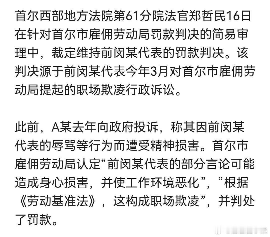 法院承认闵熙珍职场霸凌法院承认闵熙珍确实存在职场霸凌,原来霸凌是在这啊。闵熙珍存