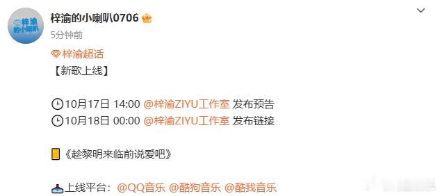 梓渝又双叒出新歌了,梓渝趁黎明来临前说爱吧发布节奏来袭,咱就说搓搓小手期待住和梓渝的新歌的见面啦~