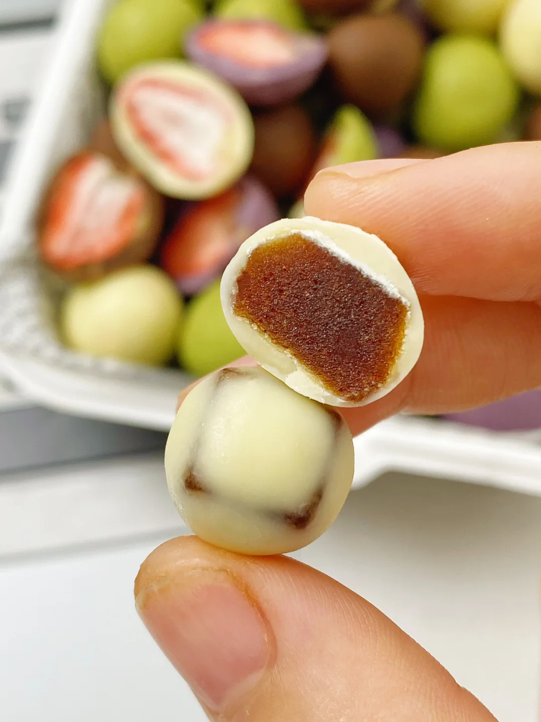 除了草莓巧克力,没想到里面的酸奶山楂球和松露巧克力也好好吃!山楂球小小一颗好可爱,吃起来酸甜可口还挺有嚼劲的🤤