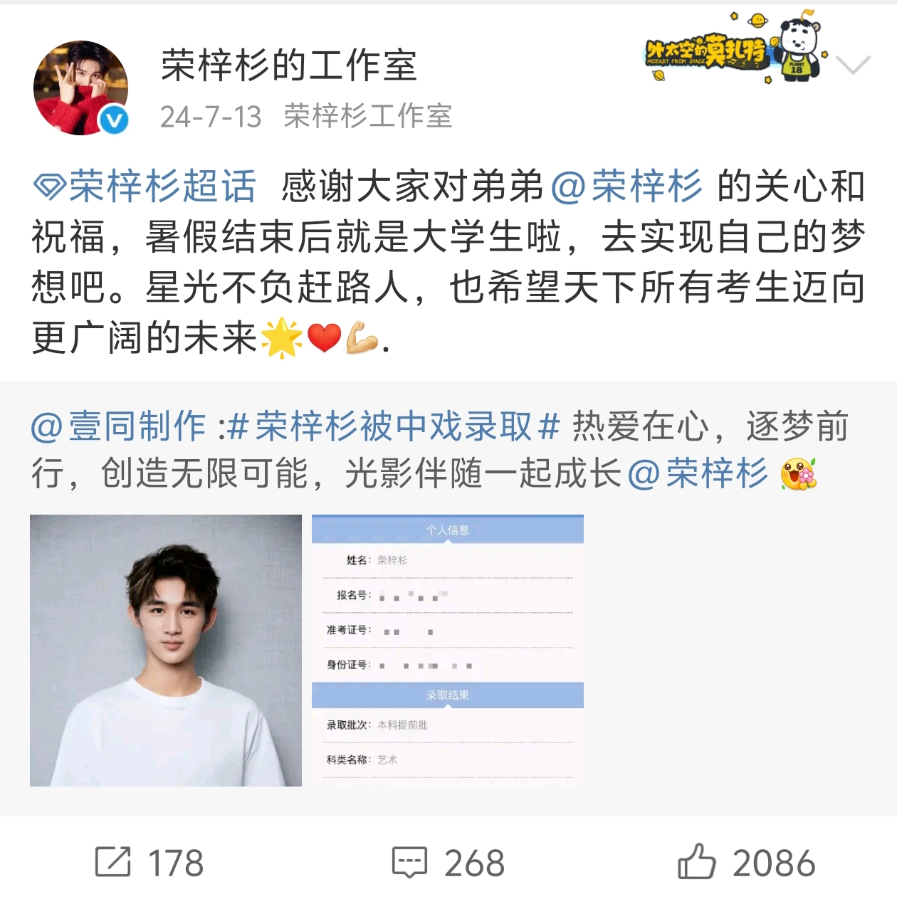 【#中戏否认荣梓杉高考文化课没过线#:如果没过线的话,是没法录取的】#中戏称荣梓杉是正常渠道录取# 连日来,19岁演员被曝出轨、打人,引发持续关注。10月17日,#荣梓杉高考文化课没过线#登上热搜,大皖新闻记者联系上中央戏剧学院本科招生办公室,工作人员回应称,“如果(文化课)没过线的话,是没法录取的。”