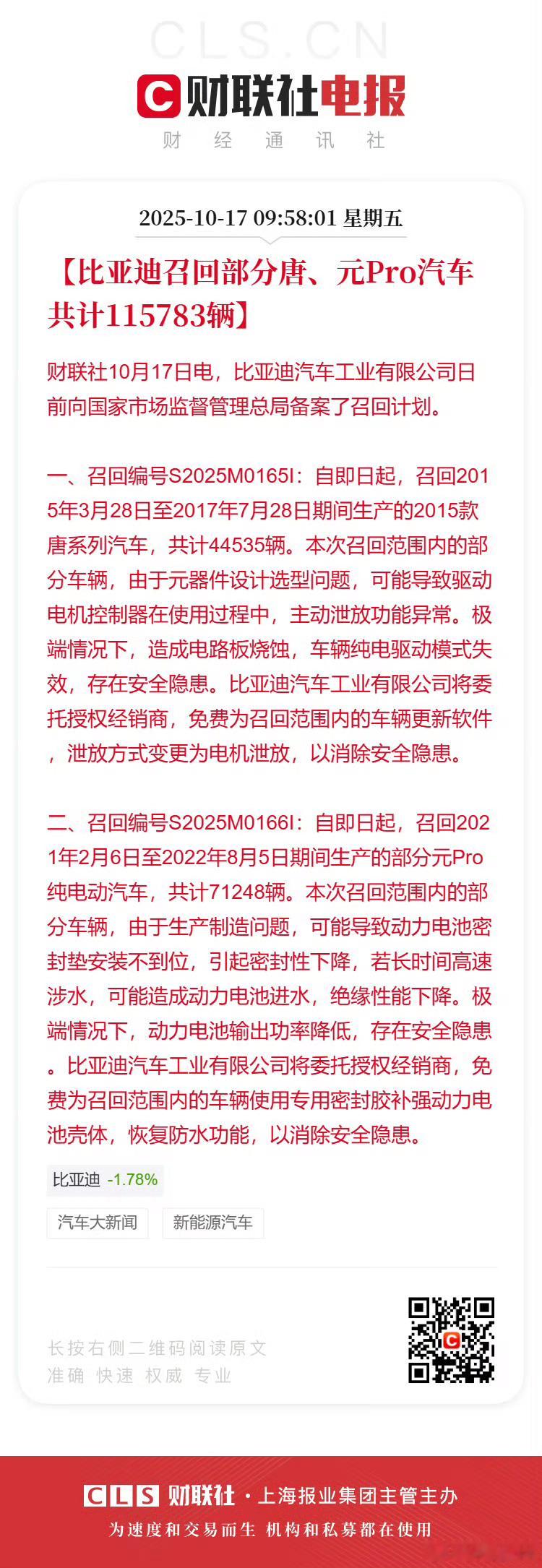 比亚迪召回 比亚迪召回11万辆车,涉及的车型是2015年3月28日至2017年7月28日期间生产的2015款唐系列,共计44535辆。2021年2月6日至2022年8月5日期间生产的部分元Pro 纯电动汽车,共计71248辆。