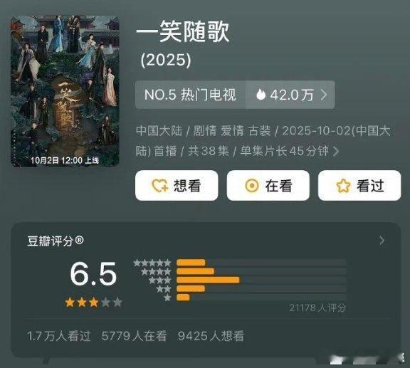 《一笑随歌》《宴遇永安》豆瓣开分,分数是观众对两部剧综合质量的初步回应,开分结果让两部剧在口碑赛道上有了起点,后续随着观剧人数增加,分数或会呈现不同的变化趋势,值得关注。宴遇永安一笑随歌豆瓣开分一笑随歌宴遇永安豆瓣开分