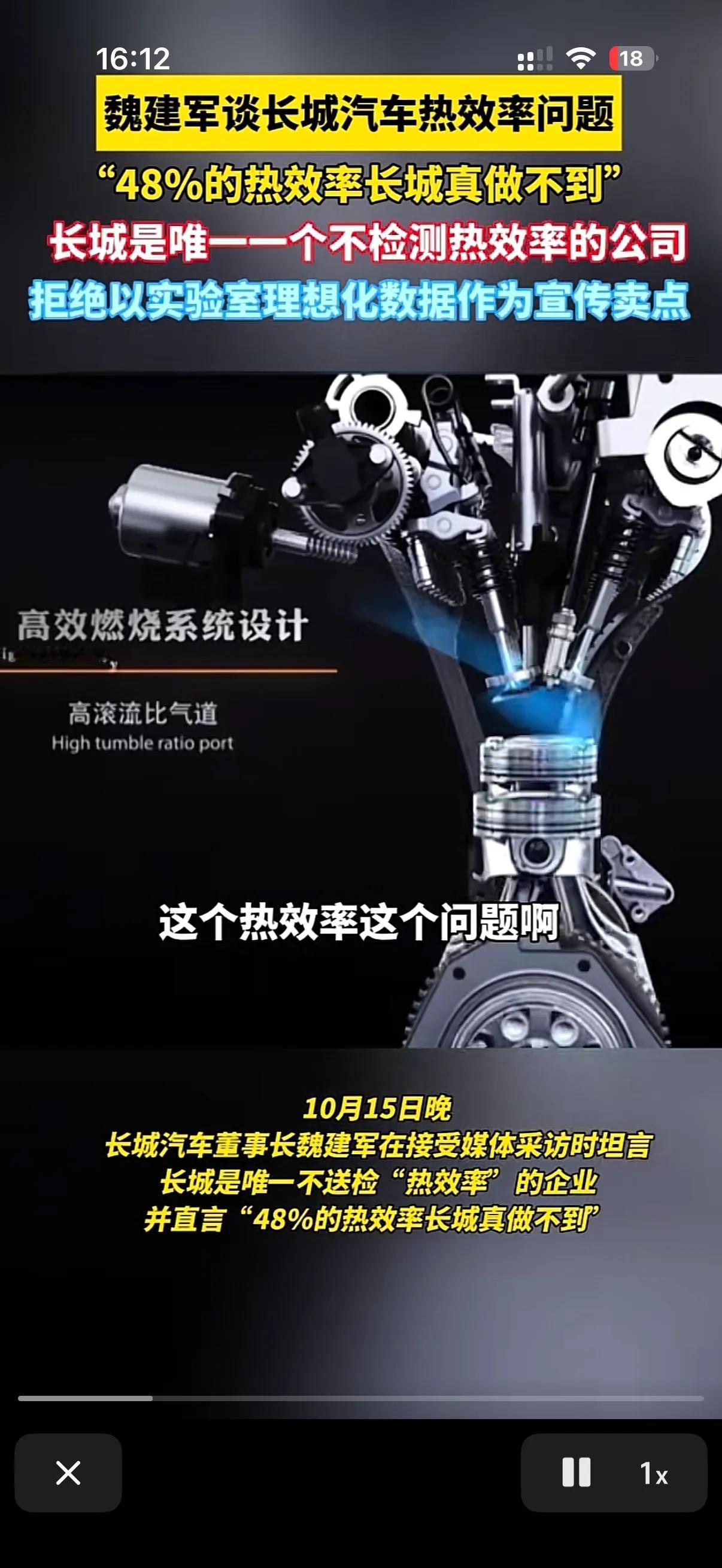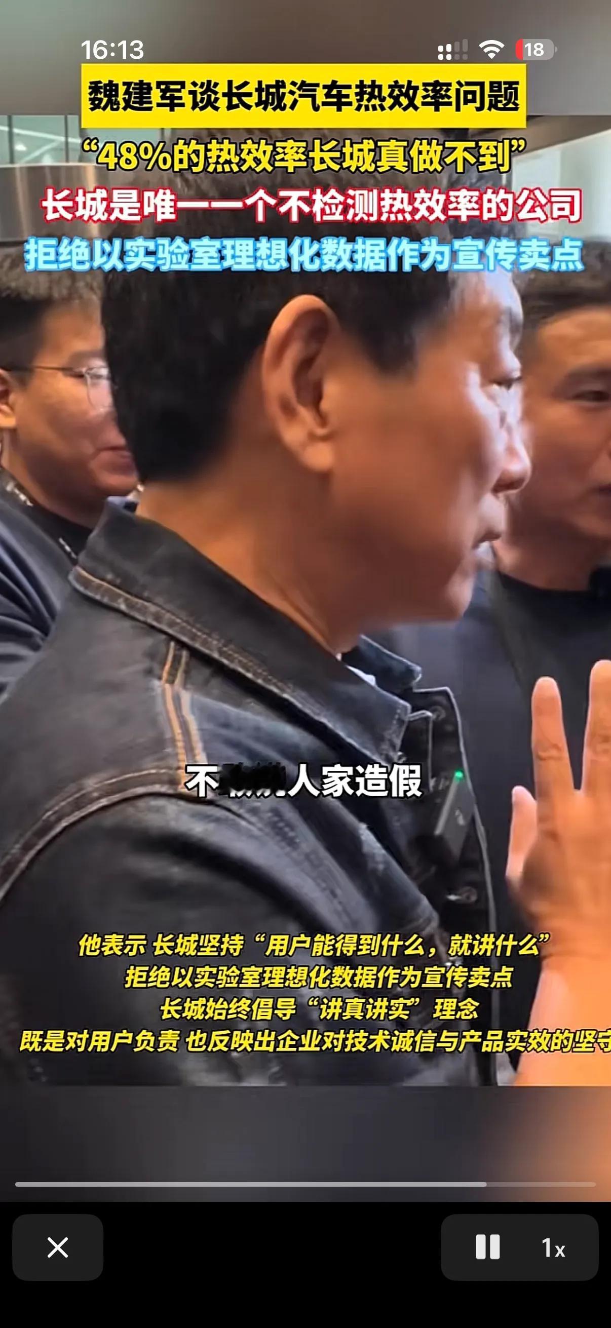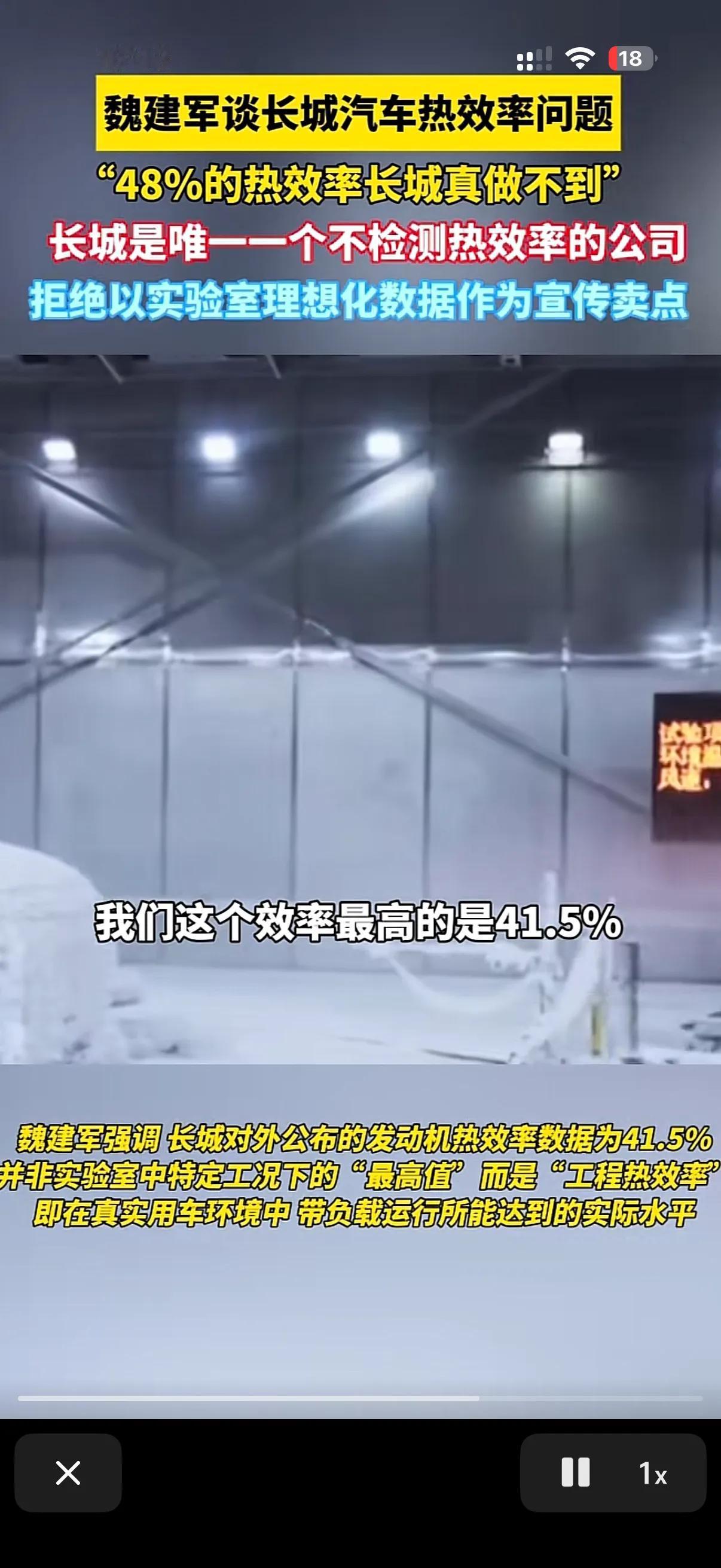 长城魏建军在接受汽车爱好者提问关于热效率的问题时,坦言自己的长城现在的热效率在最理想的状态也只能达到百分之41.5! 长城也从来不去关于热效率的检测! 魏建军坦言热效率百分之48 ,长城肯定是做不到的! 自己也不会说别人做到热效率百分之48就是撒谎!长城也不以实验室理想化数据来做卖点!