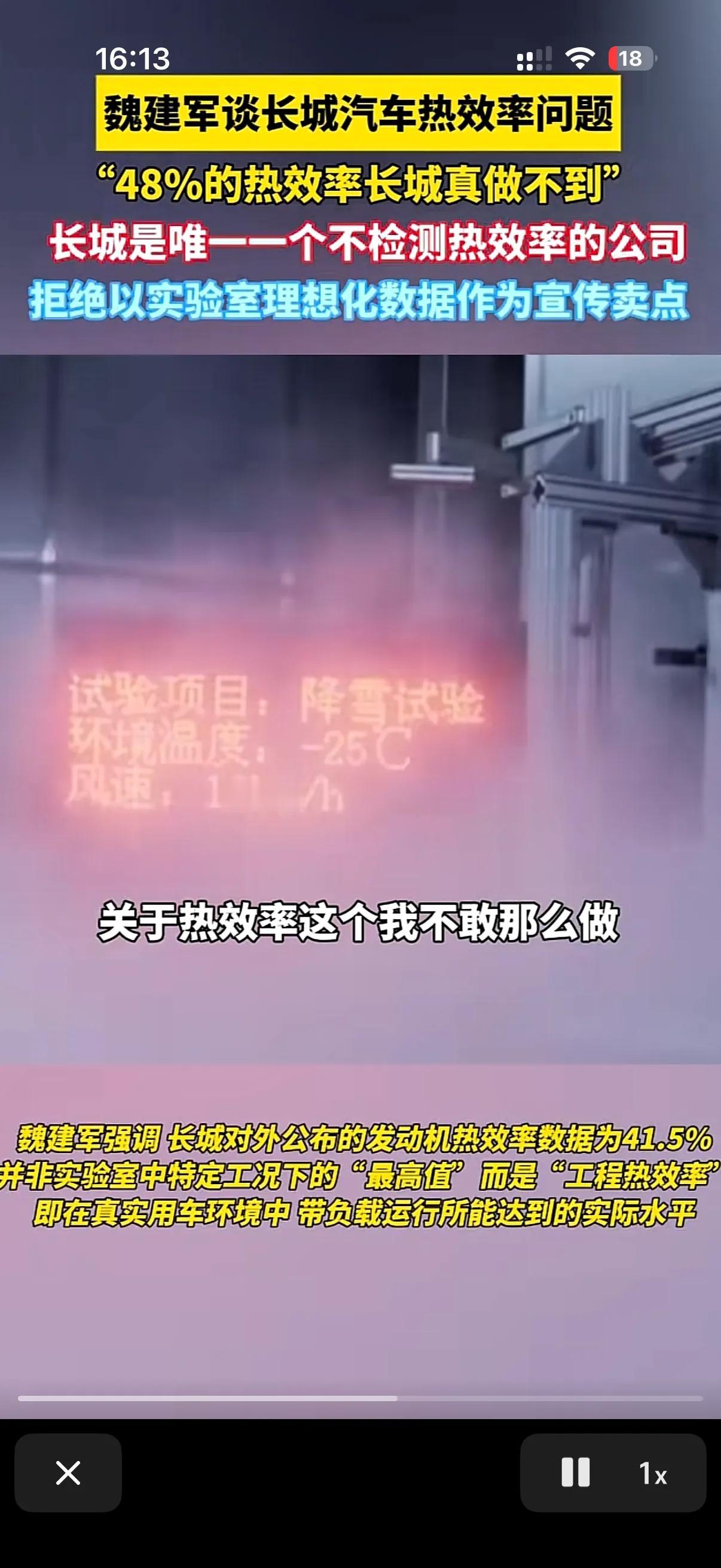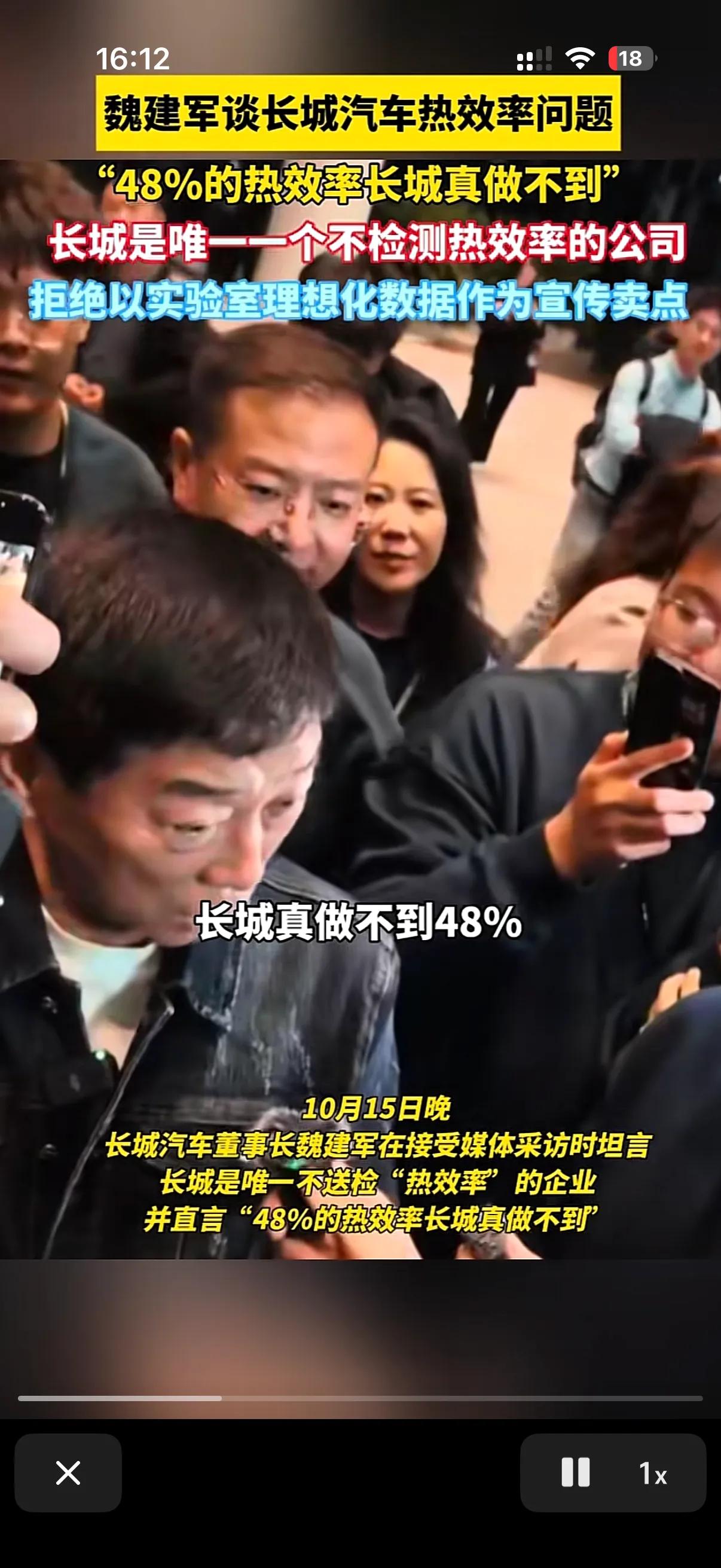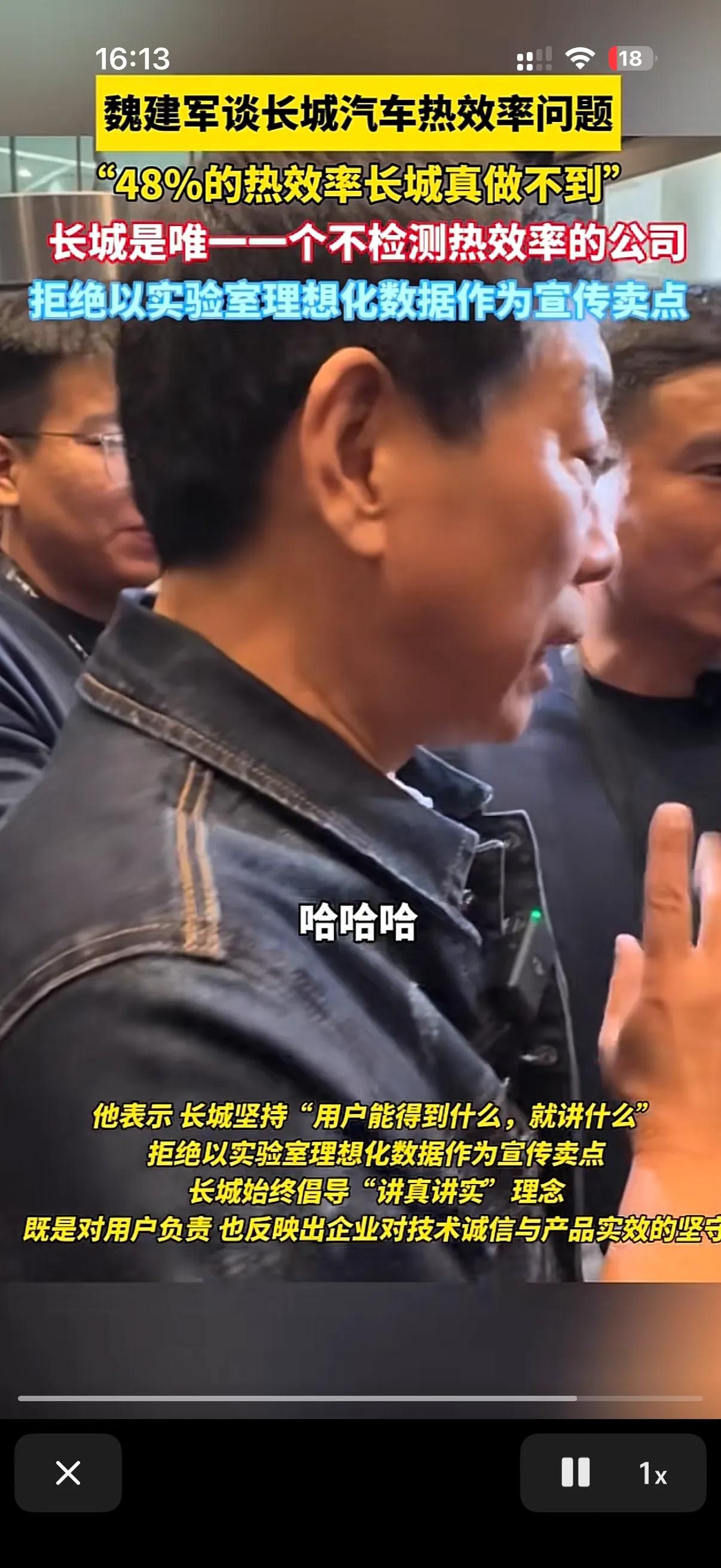 长城魏建军在接受汽车爱好者提问关于热效率的问题时,坦言自己的长城现在的热效率在最理想的状态也只能达到百分之41.5! 长城也从来不去关于热效率的检测! 魏建军坦言热效率百分之48 ,长城肯定是做不到的! 自己也不会说别人做到热效率百分之48就是撒谎!长城也不以实验室理想化数据来做卖点!