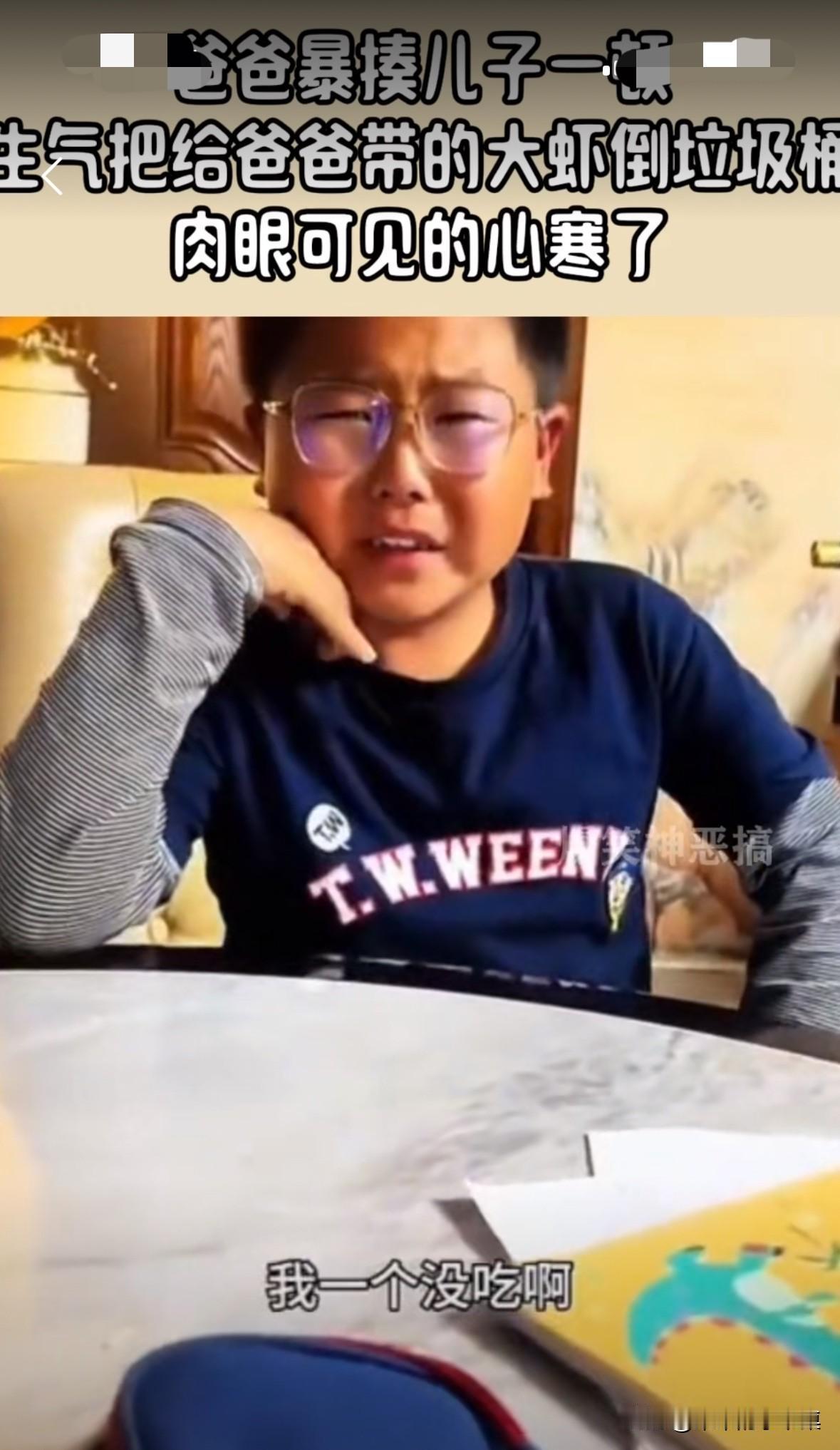 爸爸给儿子辅导作业,没过一会就急眼了,直接暴揍儿子一顿。 儿子气不过,直接把给爸爸从学校带的虾倒进垃圾桶! 据了解这个虾是儿子学校发的,一共6个,儿子说:“我一个都没吃!”真心寒了! 但是我觉得这孩子脾气太大了,还得揍。一码归一码,你孝顺是孝顺,但是你作业是真不会。辅导作业