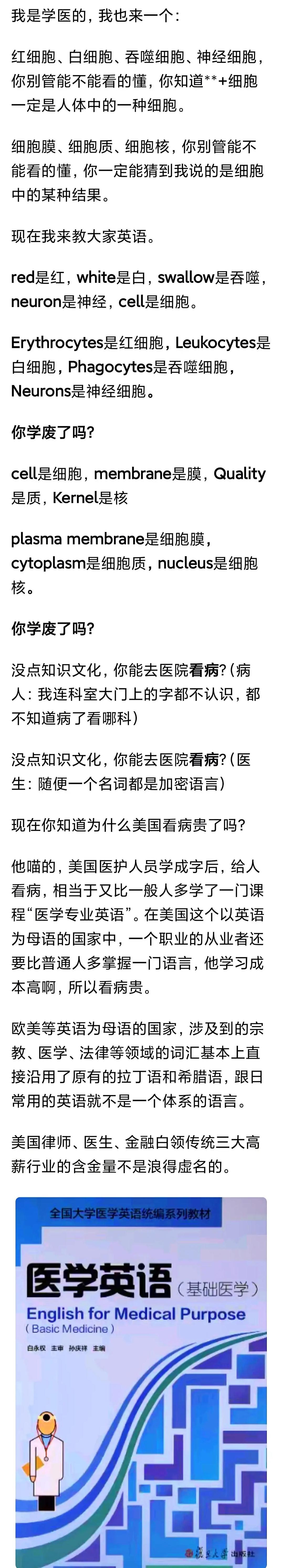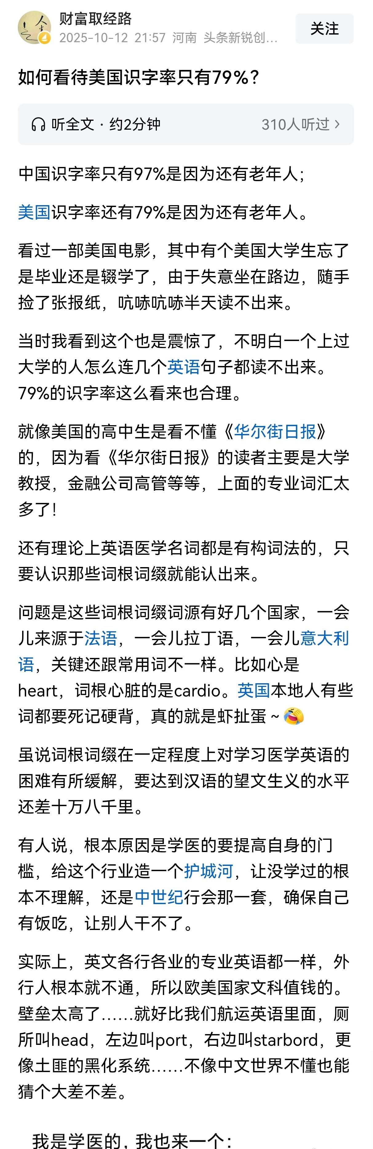 真的假的?美国识字率只有79%?还是因为老年人贡献比较多的原因! 读罢下面的文章,你就知道了,是英语的弊端限制了其国民的文化水平,当然,各行各业私设门槛也是重要原因之一。 怪不得医院前台要有导医,不然不知道看哪科,原来是学老美的,这也是和国际接轨吧。 以前很多文章都在吹英语是最科学的语言,可很多西方人并不知道葡萄酒和葡萄干是葡萄做的,因为这几个英文不搭边! 手下过万的大型帮派,如天地会/洪门/山口组等,都有切口,也就是自创的一套内部语言,行业英语也是这个逻辑! 每出一下新东西,英文就得新造一个词,所以英文词典越来越厚,中文熟悉3~5千个字所有文章都可以看,这就是中文的先进性,所以人工智能欧美永远比不过中国,这是文化决定的!