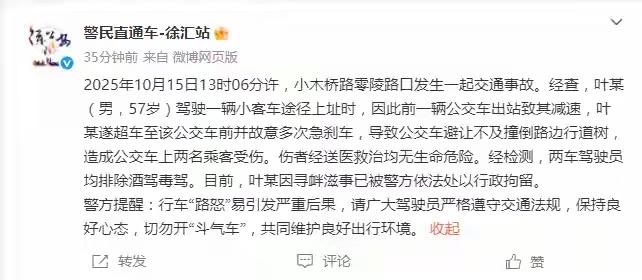 上海这起交通事故看得人火大!2025年10月15日13时06分,在小木桥路零陵路口,57岁的叶某就因为公交车出站让他减速,居然超车到公交车前多次急刹。这一闹,公交车避让不及直接撞上路边行道树,两名乘客受伤。还好伤者送医后没啥生命危险,不然叶某这罪过可就更大了。 检测显示两车司机都没酒驾毒驾,纯粹是叶某“路怒”搞事情。现在他因寻衅滋事被行政拘留,真是大快人心。开车可不能这么冲动,“斗气车”开不得,不然害人害己,大家都得引以为戒! 交通 交通事故