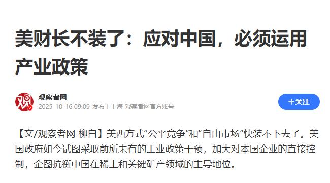 美西方式“公平竞争”和“自由市场”快装不下去了。美国政府如今试图采取前所未有的工业政策干预,加大对本国企业的直接控制,企图抗衡中国在稀土和关键矿产领域的主导地位。 美国财政部长贝森特当地时间10月15日在一场论坛上再次披露了这一意图。他透露,特朗普政府正寻求通过加强对美国关键战略领域企业的管控,来应对中国的新经济举措。 而分析指出,美国这套“自由市场”的幌子确实快遮不住了,以前天天把“公平竞争”挂嘴边,对着别人的产业政策指手画脚,说这是“政府干预市场”,不符合“规则”,现在自己倒急着下场亲自操盘,说到底还是被中国在稀土和关键矿产领域的底气给逼的。 但中国在这行的主导地位可不是光说出来的,国际能源署去年的报告里写得明明白白,20种关键矿产里,中国是19种的主要冶炼国,全球市场份额能占到70%。 单说稀土,中国储量占全球37%,但中重稀土储量超80%,这种更金贵的资源几乎是垄断级的存在。 更关键的是加工环节,全球95%的稀土精炼加工产能都攥在中国手里,就算其他国家挖得出稀土原矿,也得运到中国来提纯,美国加州帕斯山的稀土矿,80%都得送过来加工,因为中国掌握着17种稀土元素99.99%纯度的提纯技术,这可不是随便建个厂就能追上的。 这种优势直接戳中了美国的软肋,奥地利有个调查机构算过,78%的美国武器系统都依赖中国的矿产,海军的武器系统对稀土依赖度更是高达91.6%。就说美军的宝贝疙瘩F-35战斗机,每造一架就得用417公斤稀土,雷达、隐身涂料、发动机这些核心部件离了稀土根本造不出来。 不光是军工,新能源、芯片这些美国想抢占先机的领域也一样,锂、钴这些关键矿产,中国在产业链上的话语权同样稳固,美国车企想造电动车,电池原材料绕来绕去还是得找中国供应商。 以前美国靠着全球采购还能蒙混过关,觉得市场自然会调节供应,可现在中国一收紧出口管制,它就慌了神。 2025年中国实施的新管制政策,专门盯着那些可能流向军事用途的稀土磁材、靶材,还得搞终端用途认证,这一下就卡了美国87%的装备供应链的脖子。像钇元素是喷气发动机热障涂层的必需品,镝和铽是高精度陀螺仪的核心成分,这些东西要是断供,F-35生产线就得慢下来,导弹制导系统都可能失准,美国军工企业能不急吗? 这时候美国哪还顾得上“自由市场”的面子,特朗普政府直接签发了《释放美国离岸关键矿产和资源》行政令,赤裸裸地要政府下场管控。 商务部和内政部立马跟上,简化深海采矿的审批流程,把探矿许可证期限从3年延到5年,还合并了勘探和开采的审批环节,就为了快点挖出矿来。 企业也跟着动,洛克希德·马丁重新“激活”了深海采矿项目,加拿大金属公司赶紧在美国子公司提交了矿区申请,连韩国锌业都凑过来,砸了8520万美元给加拿大公司,想在美国建精炼厂分一杯羹。 更有意思的是,美国还拉着盟友搞“小圈子”,想一起建供应链,可效果实在拿不出手。 欧盟自己都算过,就算到2040年,还得85%依赖中国稀土,因为建一套完整的冶炼加工体系不仅要十几年时间,成本更是天文数字。 美国自己搞的本土供应链也进展缓慢,挖矿容易加工难,环保问题、技术瓶颈一堆麻烦,短期内根本补不上缺口。 贝森特在论坛上提中国上周的稀土出口管制,说必须实现自给自足或找盟友合作,这话听着是找原因,其实是露了怯。 毕竟以前喊着“政府不干预市场”的是他们,现在逼着企业报供应链、给补贴、定合作名单的也是他们,所谓的“自由市场”原来只是对别人的要求,自己没优势了就立马换规则。 这哪是公平竞争,分明是输不起后的急眼操作,而中国在关键矿产领域的产业链优势,恰恰戳破了这种双重标准的虚伪,让美国不得不撕下伪装,亲自下场拼实力。