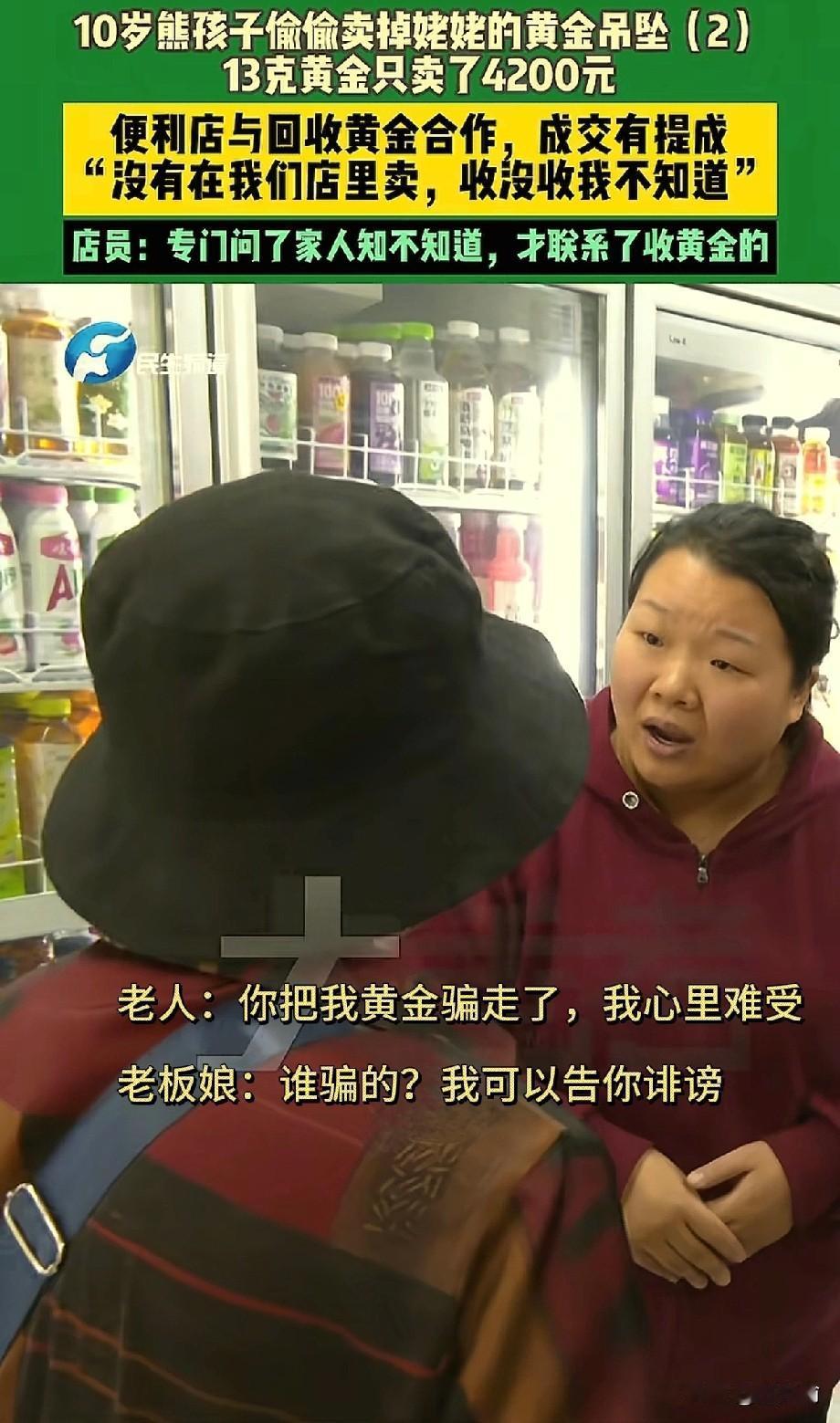 河南,10岁男孩偷偷拿走姥姥的13克黄金吊坠,结果只卖了4200元,但按市场价格至少值1.2万。回收商提出补偿5000元私了,姥姥拒绝说她不要钱,只要一个道歉。 男孩趁奶奶做饭的时候把吊坠拿到小区便利店,店员明知他是小孩,只口头问了一句家里人知道吗,就帮他联系了黄金回收商。 整个交易没有核实身份,也没联系家长,两个小时就完成了。 男孩拿到钱后花2300买了手机,然后还请同学吃炸鸡、给游戏充钱。晚上姥姥发现吊坠不见了,反复追问下男孩才说出真相。 家人找便利店和回收商时,却被各种推诿,有人说货已熔了,交易合规,有人直接失联。便利店老板娘说交易又不在店内进行,还要告老人“诽谤”。 后面经过调解,回收商提出补偿5000元但要求删除视频,被姥姥拒绝。 专业回收商应该知道,不能收未成年人的东西,需要监护人同意。但这家回收商不仅没核实身份,还用远低于市价的价格收购,明显有问题。事后还把黄金熔了,想逃避责任。 便利店虽然说交易不在店内,但实际上是他们牵线搭桥,所谓的口头询问只是走过场,其实是为了赚提成。 10岁孩子做错了事可以教育,但商家的错必须严惩。