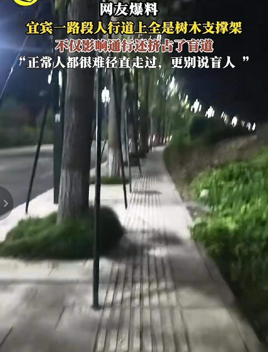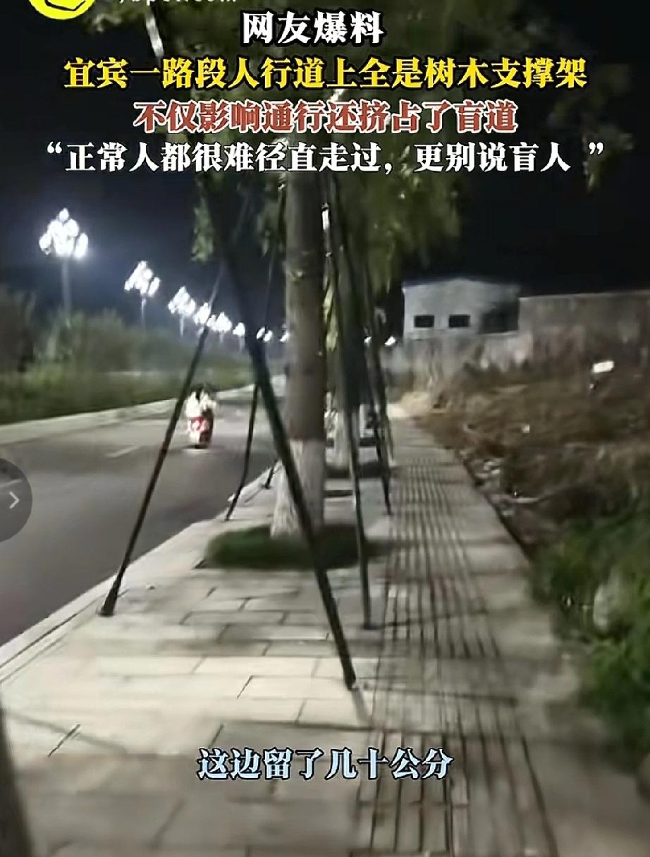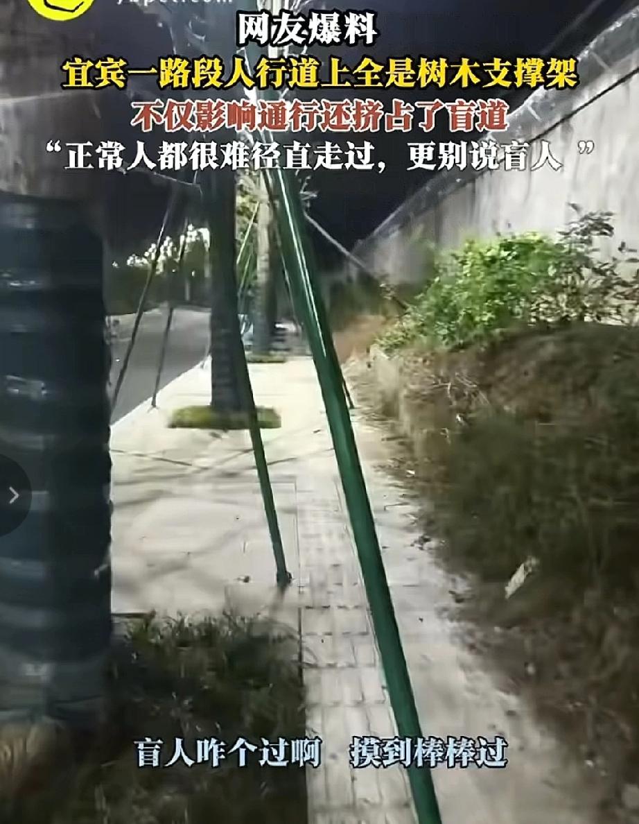宜宾人行道被树架堵死,盲人咋过路?网友:摸到棒棒走。 宜宾一条人行道,最近被树木支撑架占满了。 好好的路,现在正常人走都得绕着走,更别说盲人了。盲道本是盲人出门的“眼睛”,现在全被铁架、木架挡住,手拄盲杖一不小心就会撞上去,太危险了。 有网友无奈调侃:“正常人都难走,盲人咋个过?摸到棒棒过哟!” 其实,种树护树是好事,但也不能光顾着树,忘了走路的人。选占地小的支撑架,或者把架子往路边挪挪,都能给行人留条道。毕竟盲道是受保护的,随便占了既不方便,也不合规定。 希望相关部门赶紧去看看,把这些挡路的架子调整好。城市修路种树,不就是为了大家走得舒服、安全吗?可别让好事变成了糟心事。 网眼看宜宾