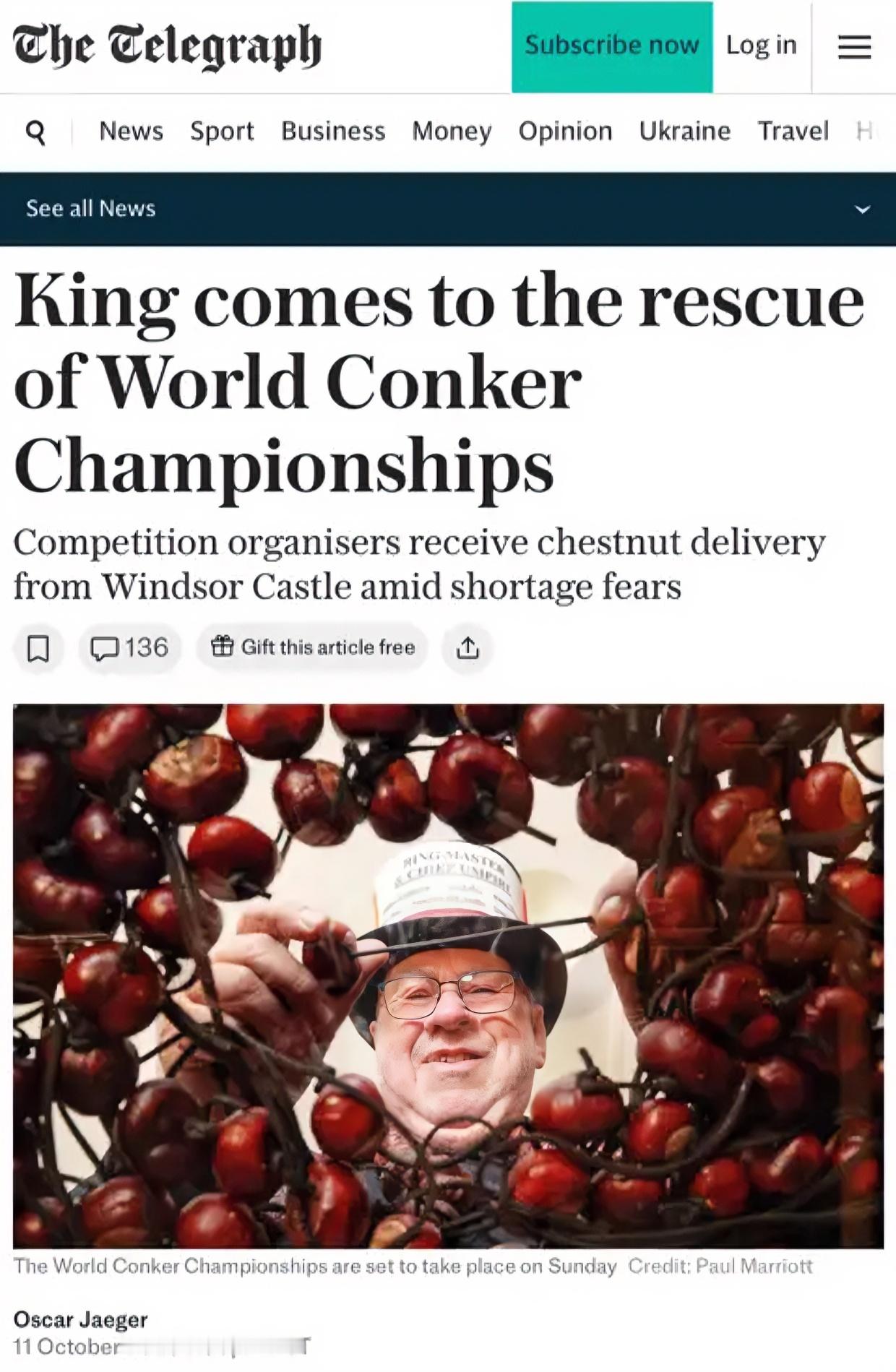 ▫️关于World Conker Championships(世界板栗锦标赛):起源于1965年,每年10月第二个星期日举办。赛事规则就是参赛者需将板栗系于25厘米长的绳索一端,通过甩动手中的绳子击打对方板栗,击碎数量多者则获胜。
