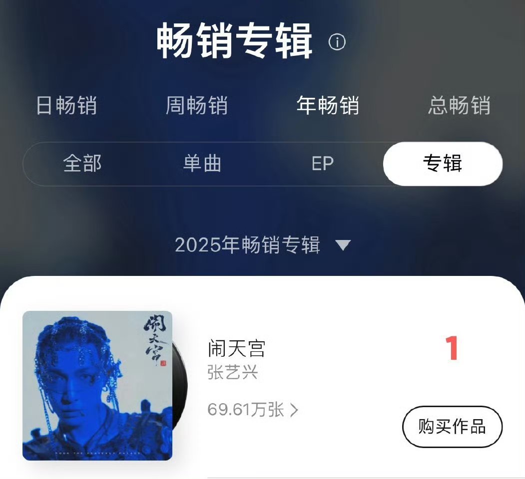 张艺兴闹天宫登顶Q音专辑畅销年榜第一,仅仅用了四十天[送花花]