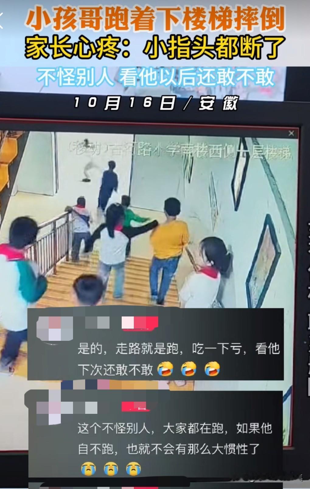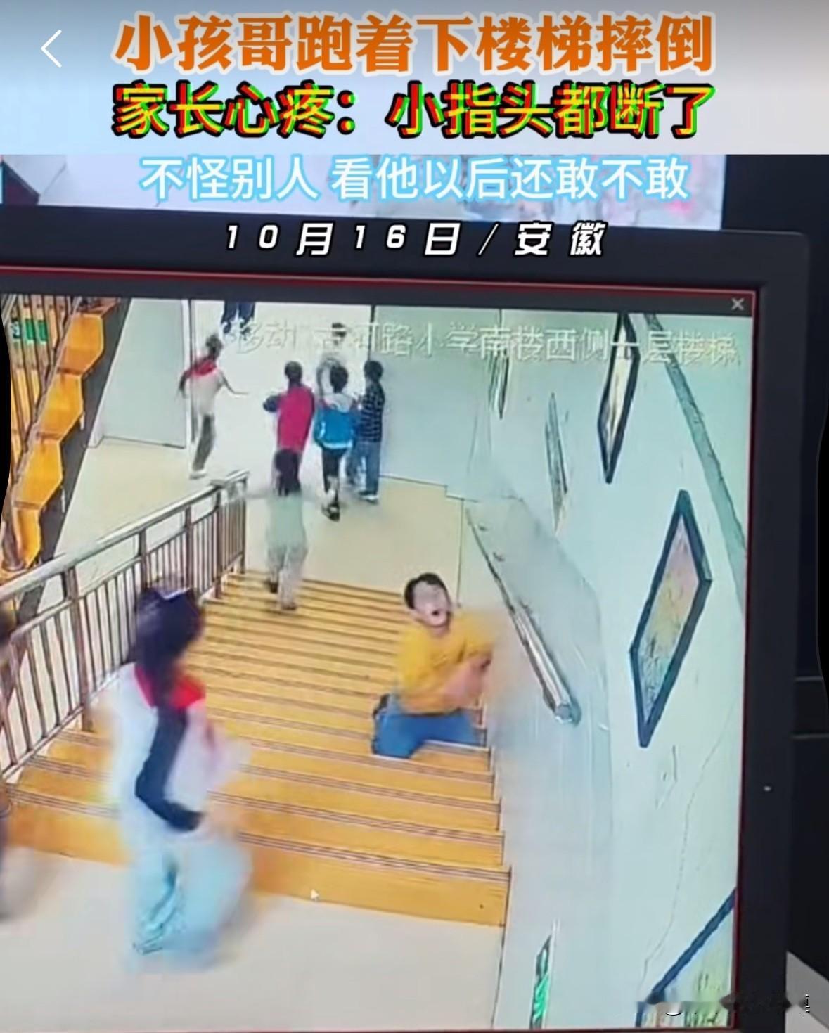 下课时间,一个小男孩下楼梯跑的非常快,手被楼梯扶手卡了一下,小手指骨折了。 家长也是不放心,到学校调取监控,才知道是自己的孩子跑的太快了。 这学校的老师都没有跟学生说吗,楼梯间不能奔跑,不能打闹,我觉得每个学校都会再三强调。 就算学生在皮,也会收敛很多的。 我觉得还是老师不负责。儿童骨折 楼梯摔伤