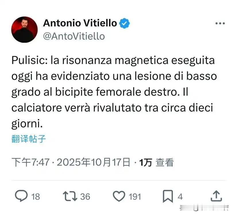 普利西奇确诊了!刚刚米兰俱乐部公布米兰美国球员普利西奇核磁检查结果,普利西奇右腿腿筋轻微撕裂,具体情况将在十天后重新评估。 普利西奇今天进行的核磁共振扫描显示他的右腿筋轻微撕裂,球员将在大约十天后接受重新评估。同时米兰首次谈到恩昆库问题,恩昆库确实缺席了昨天训练,但恩昆库问题并不大,没有意外恩昆库明天将参加球队合练。 不幸之中的万幸,普利西奇伤算轻的,腿筋轻度损伤一般半个月就能恢复,腿筋比之前爆出来的二头肌要好太多了,普利西奇回来路上二头肌出现了红肿,当时很多人担忧是二头肌出现问题,如果那样一个月两个月都有可能,现在半个月就好了,也就耽误两场比赛,就算是普利西奇轮换了,毕竟之前普利西奇太累了,一个人扛着米兰的整条锋线。