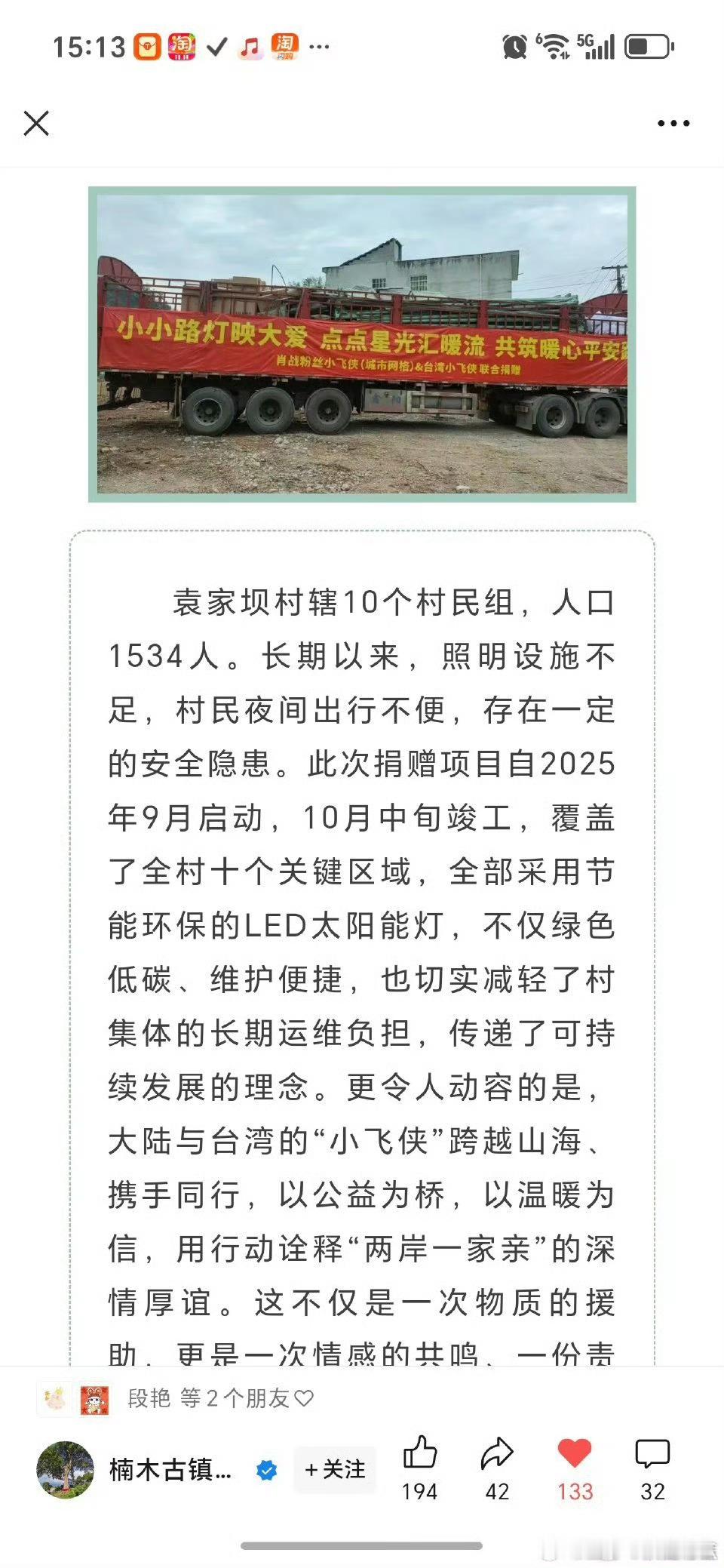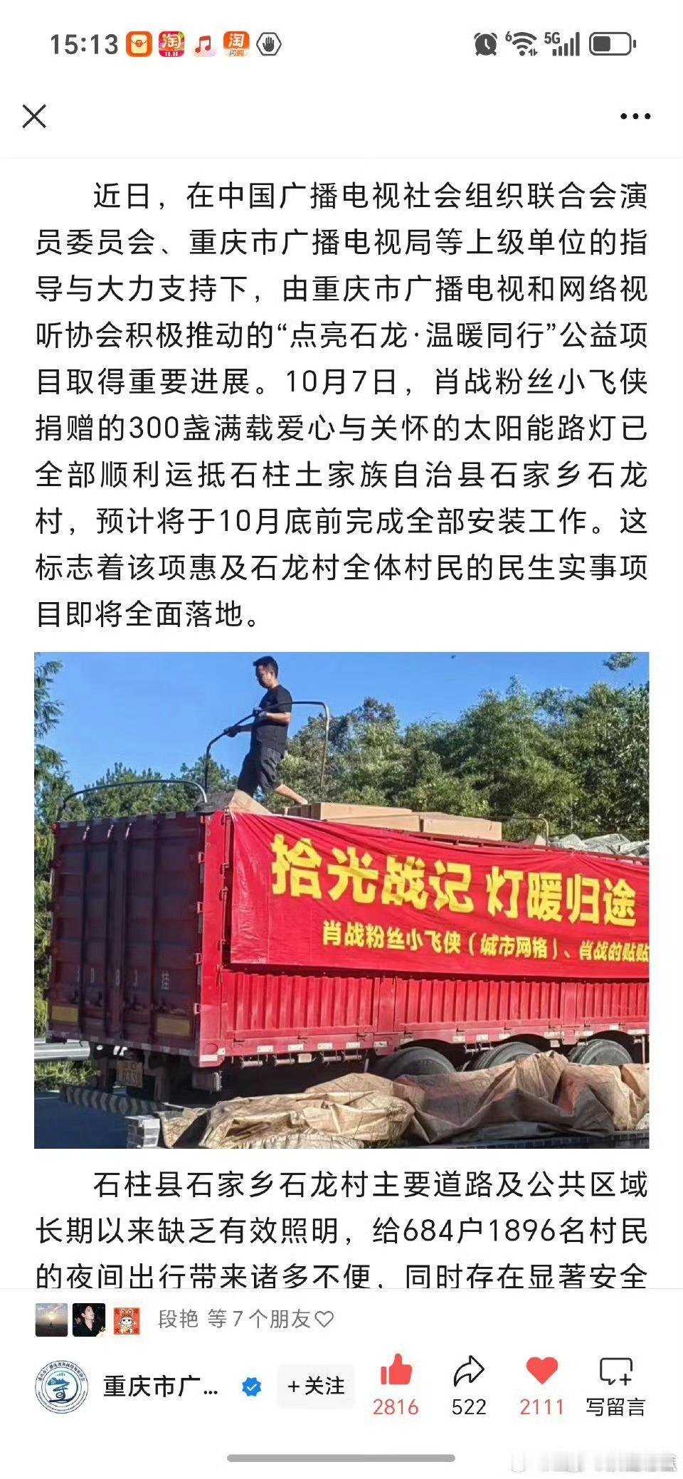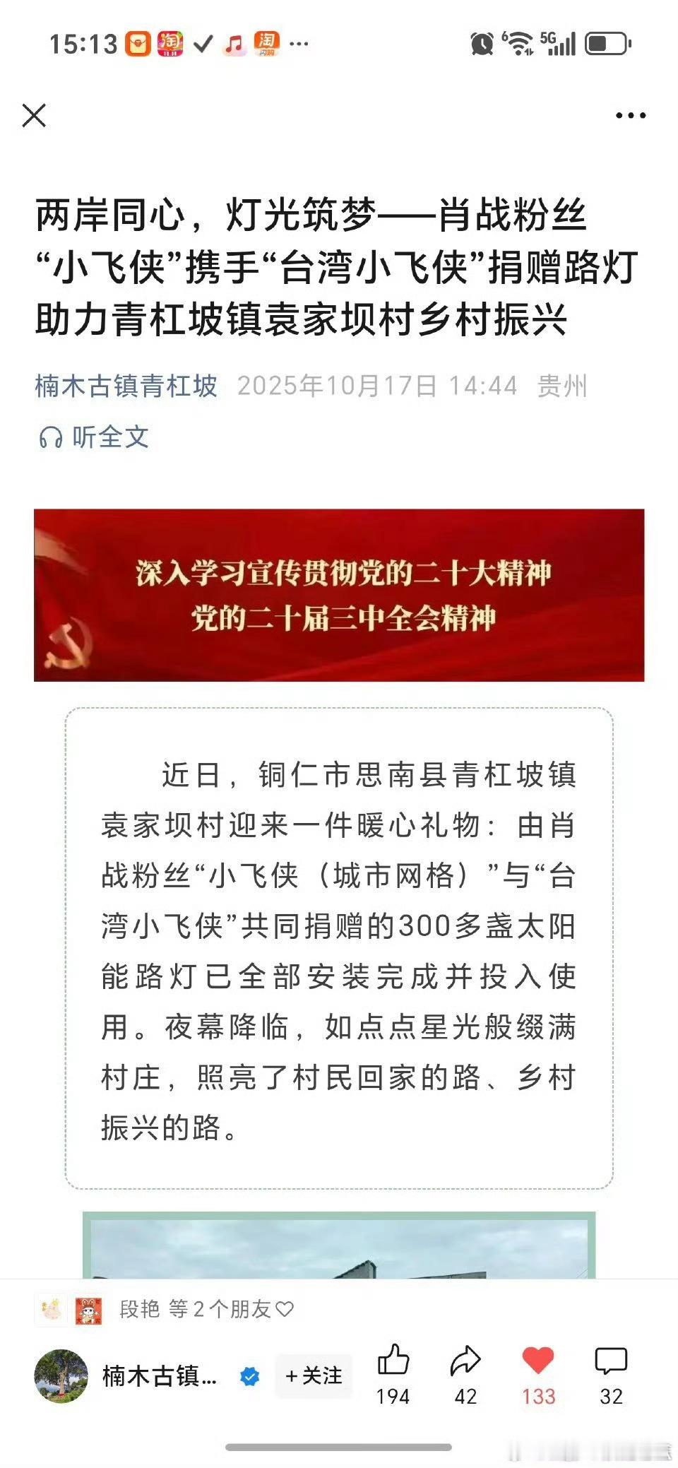 跨越海峡的温暖!肖战粉丝,台湾与大陆小飞侠携手,300盏路灯落贵州思南、300盏驻重庆石柱,用光亮传递善意与力量。正能量群体值得夸奖[努力] ​​​