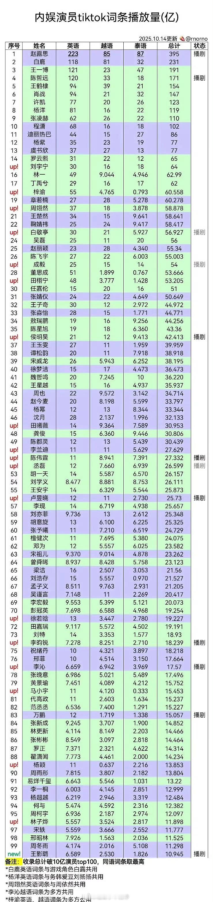 内娱演员tiktok数据top10🈶:赵露思、白鹿、王一博、陈哲远、王鹤棣、肖