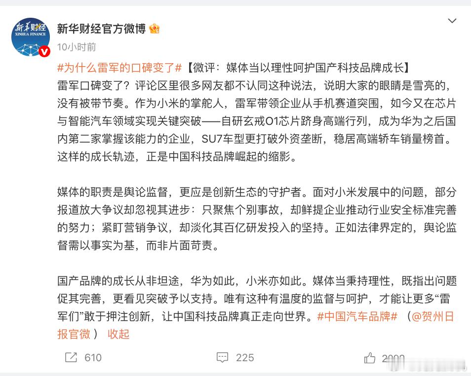 雷总带领小米从手机到芯片、汽车领域持续突破,展现了中国科技品牌的成长韧性。媒体监督不可或缺,但应更全面理性。国产品牌成长本就不易,媒体则更需要需平衡监督与支持,既促其完善,也肯定突破。这样的理性环境,才能激励更多创新,助力中国科技品牌真正走向世界。