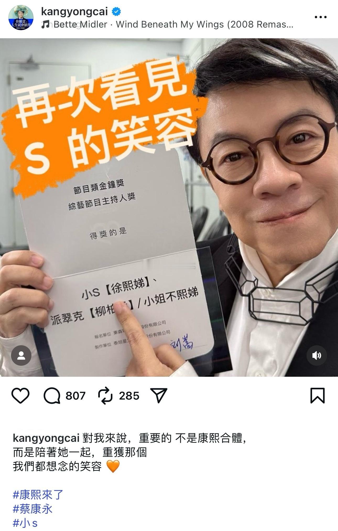 得奖的小S发文谢谢蔡康永、谢谢大S[捂嘴哭]