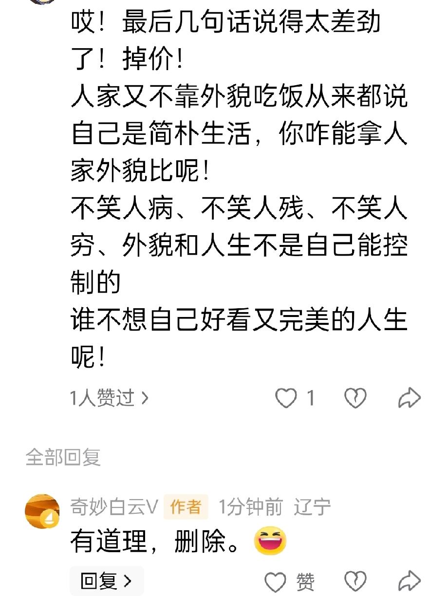 我的素质还是有待提高! 实在是抱歉,我是素老三的粉丝,总是拜读她的文章,羡慕她也佩服她,能把家长里短的小事,写得有滋有味。不大的小事,都能写几篇长篇,我是真的自愧不如! 有时候我就想,假如我姐的前夫家发生的事,要是让人家素老三写,肯定写得特别精彩! 昨天看了他儿子发了她的照片,我也不确定是不是她本人,但我看大家都在发。 所以我终于有了优越感,我们差不多是同龄人,我感觉我比她年轻,比她身材好,所以特意晒了照片,还觉得挺美呢! 评论区有好友评论,说我说的话太让人瞧不起了,人家素老三不是靠颜值吃饭的。 我看了后赶紧删除!我真的素质不行,太过火了,自不量力! 感谢友友提醒![作揖][作揖][作揖]