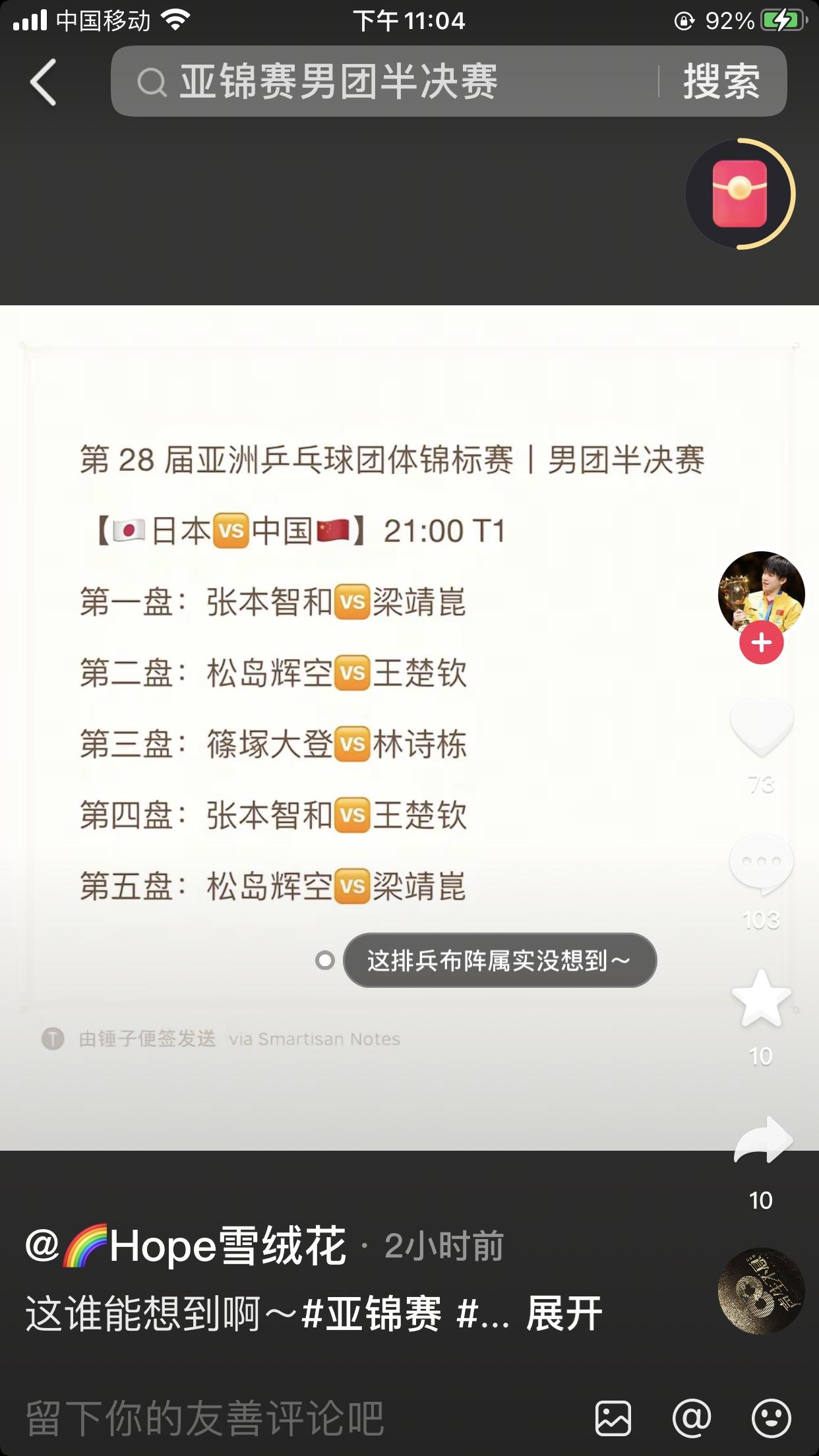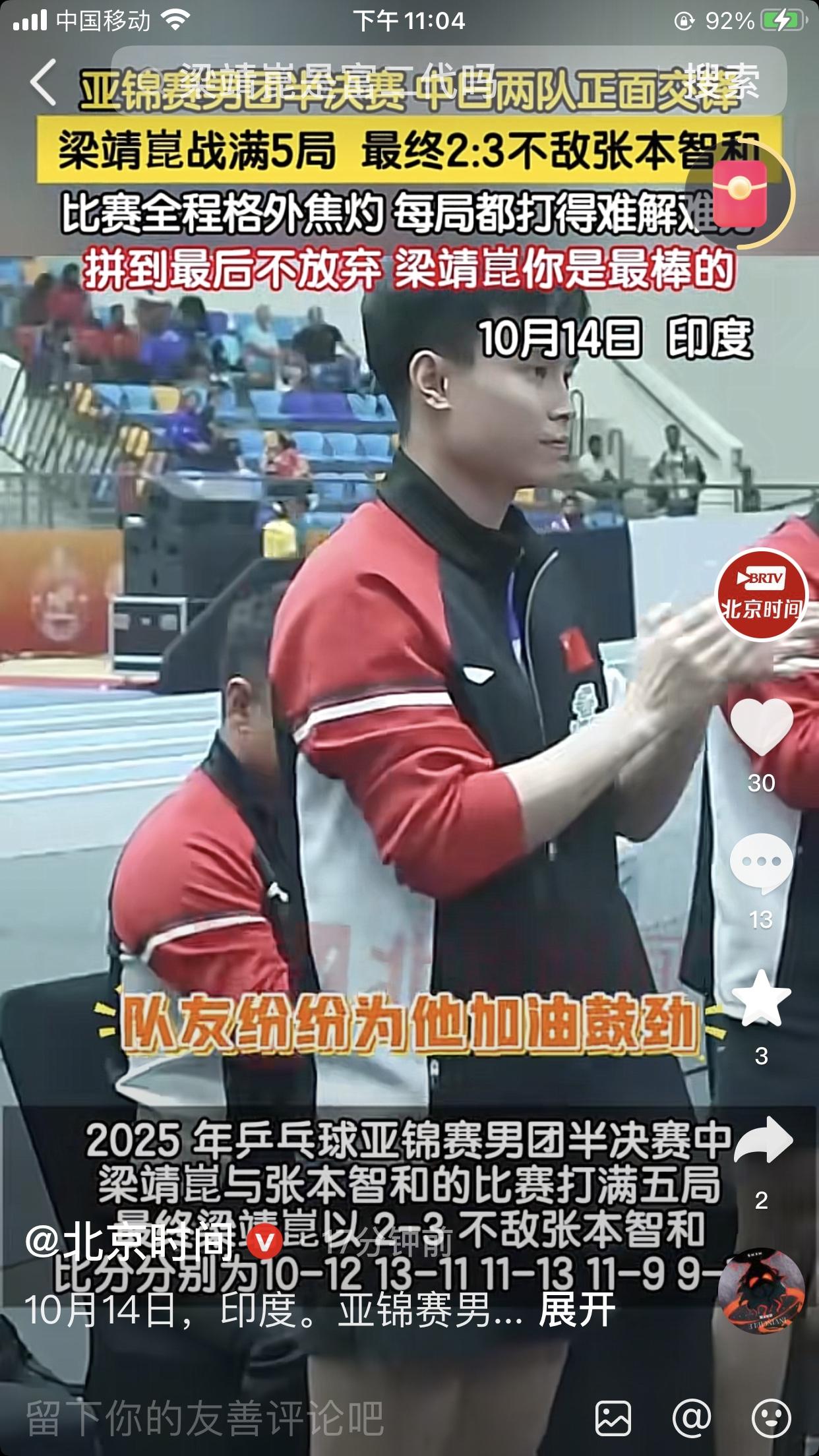 正在进行的印度亚锦赛男乒0:2落后日本。 我都不敢看了,大胖输了张本智和,大头也输给了松岛辉空,比分都是2:3。 感觉主教练王皓的排兵布阵,正如他自己的征战历史;缺乏胆识,关键时刻怯场。 哎,凉了一大半,千万别一人输一分[流泪][流泪][流泪]但愿小石头能逆转