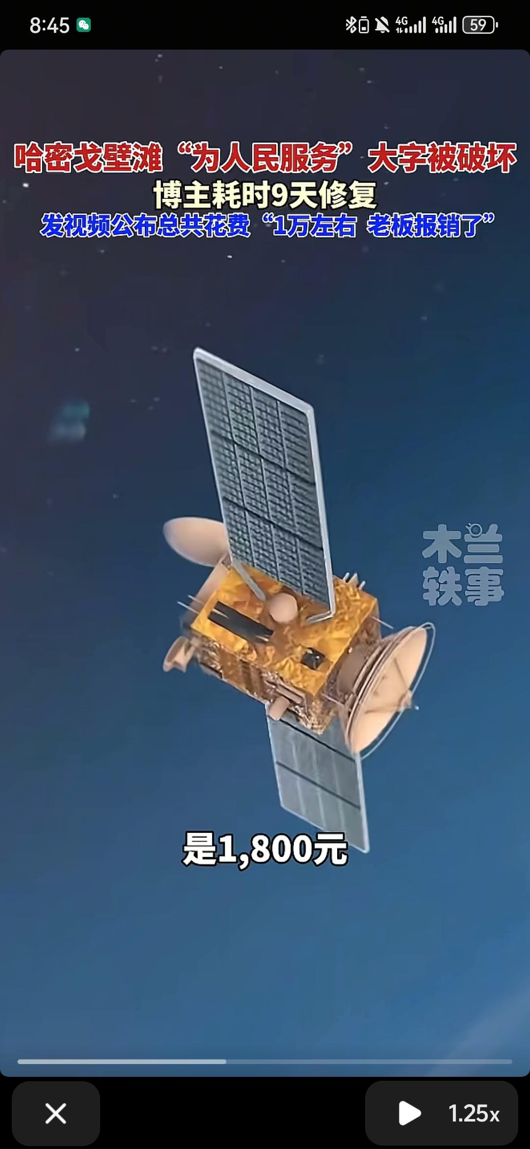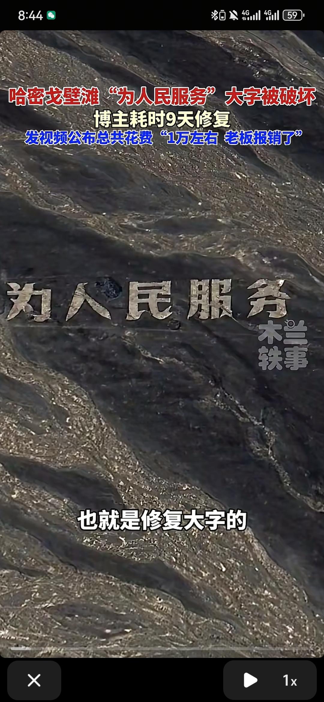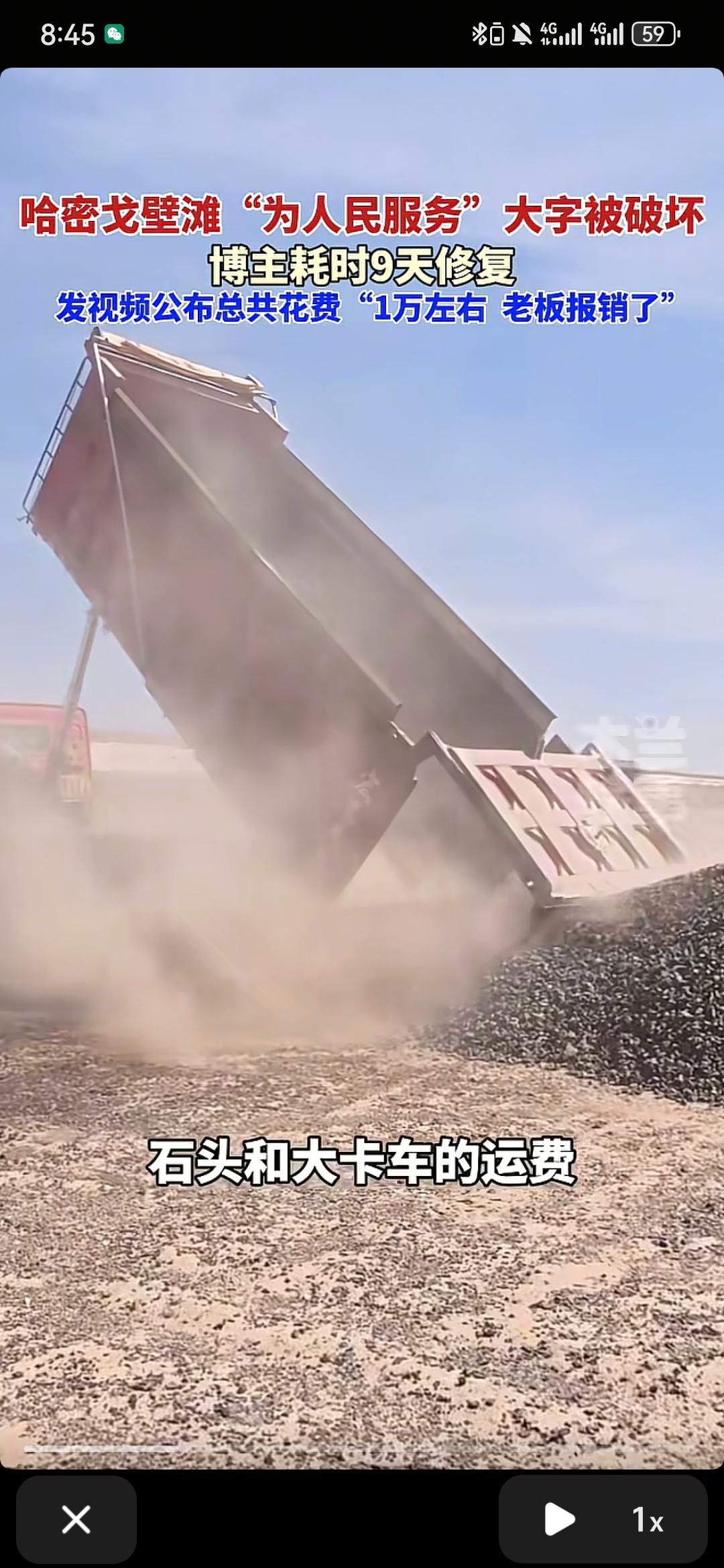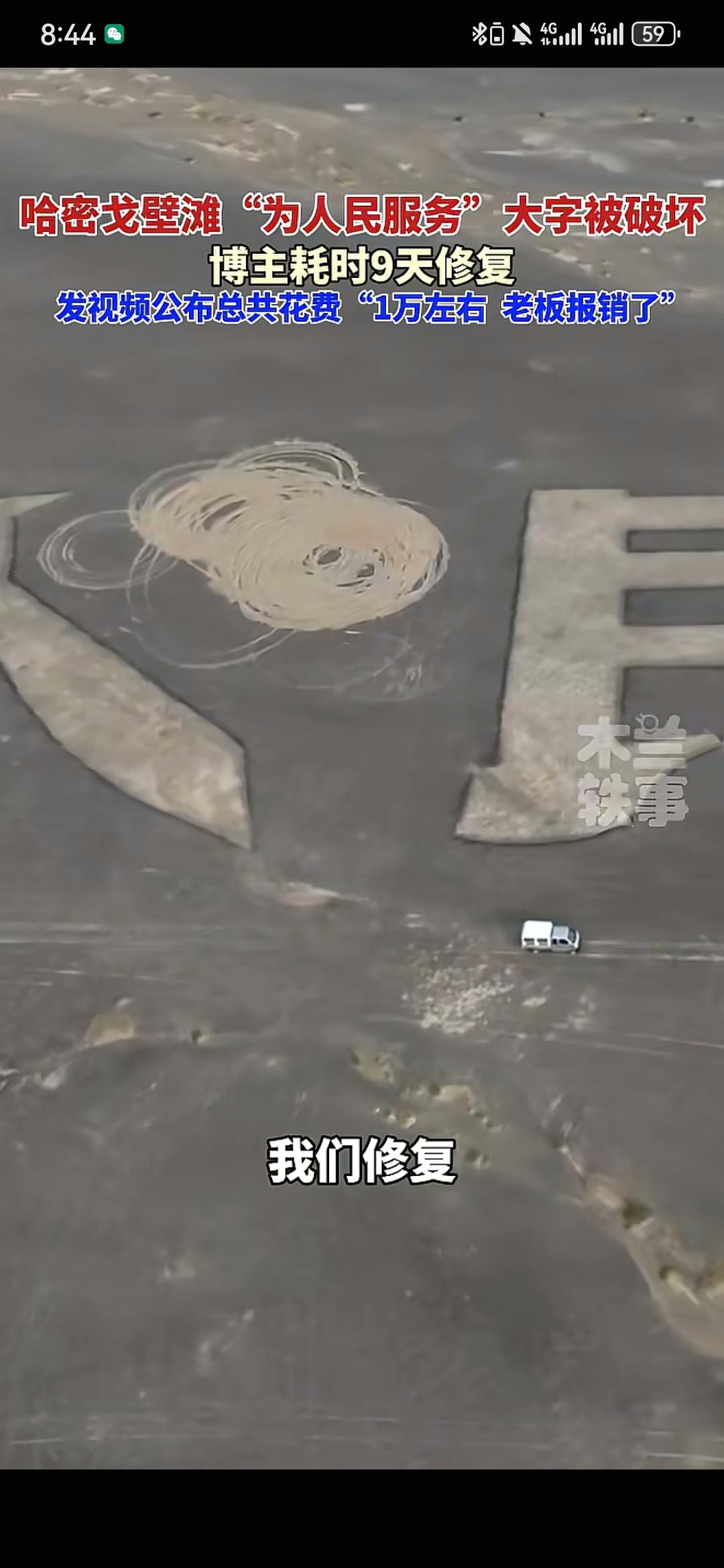 在“人”“民”之间 搞破坏的那个人 这笔钱应该由他来付! 近日,在哈密戈壁滩上的“为人民服务”的大字被破坏,这人是打心眼里的可恶! 最后是略靠谱旅行社的主持人他们进行的修复,一共话费了一万元左右。 石头和大卡车的运费是5500元,第二个是吉林卫星拍摄的第一张照片是1800元(当时对方并不知情),修复完的照片是长光卫星麻烦支持的,一共修复了九天,来回的油费以及吃饭也花了2500元左右。 这个小伙是好样的!值得表扬!照我看,要是能抓到那个破坏者,必须要严惩!