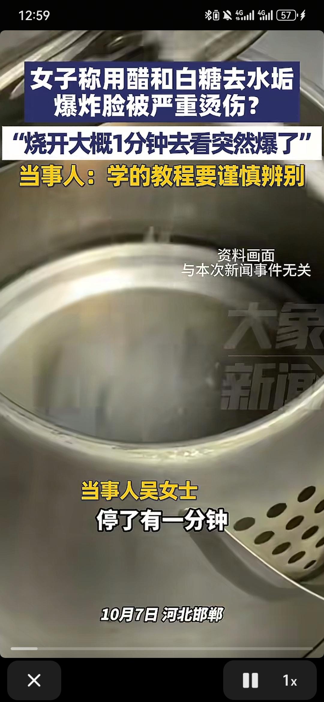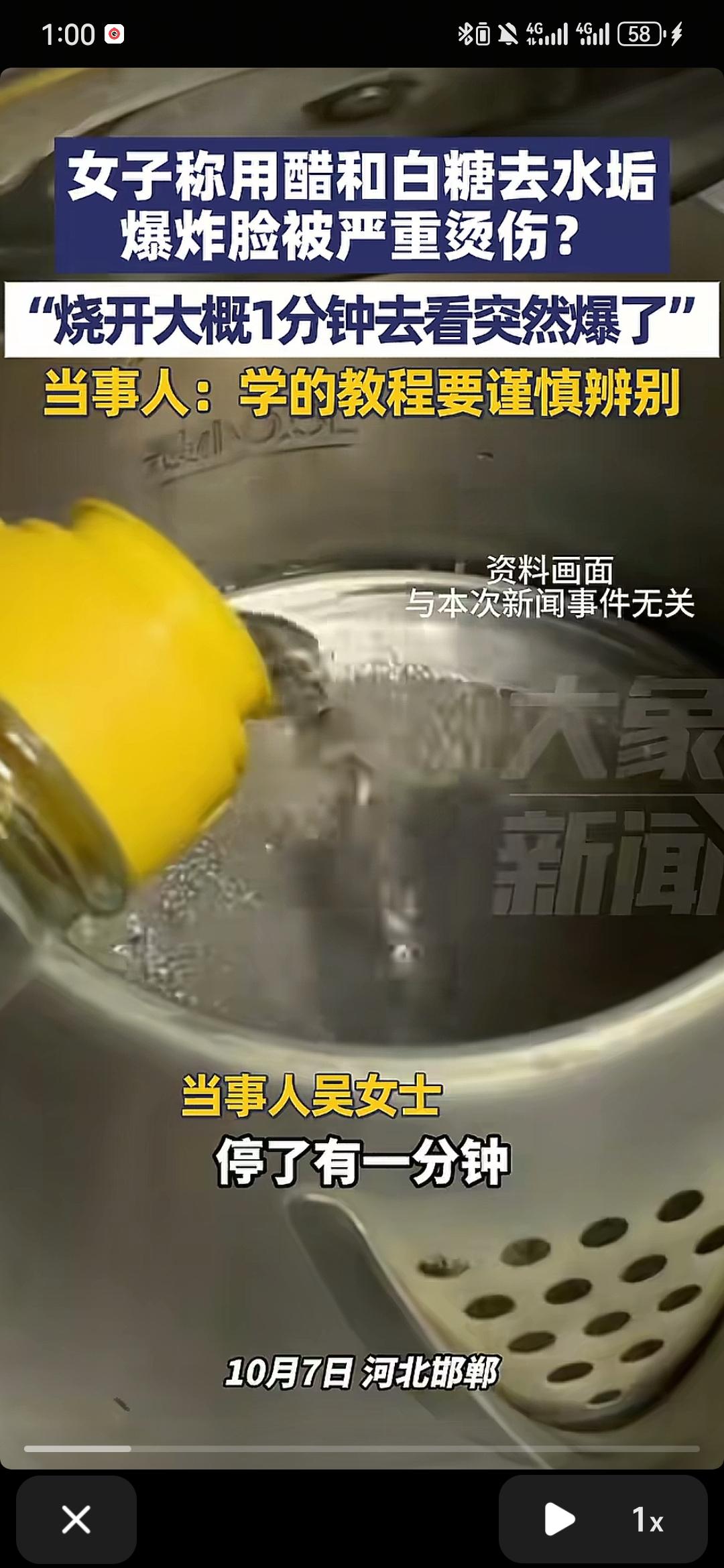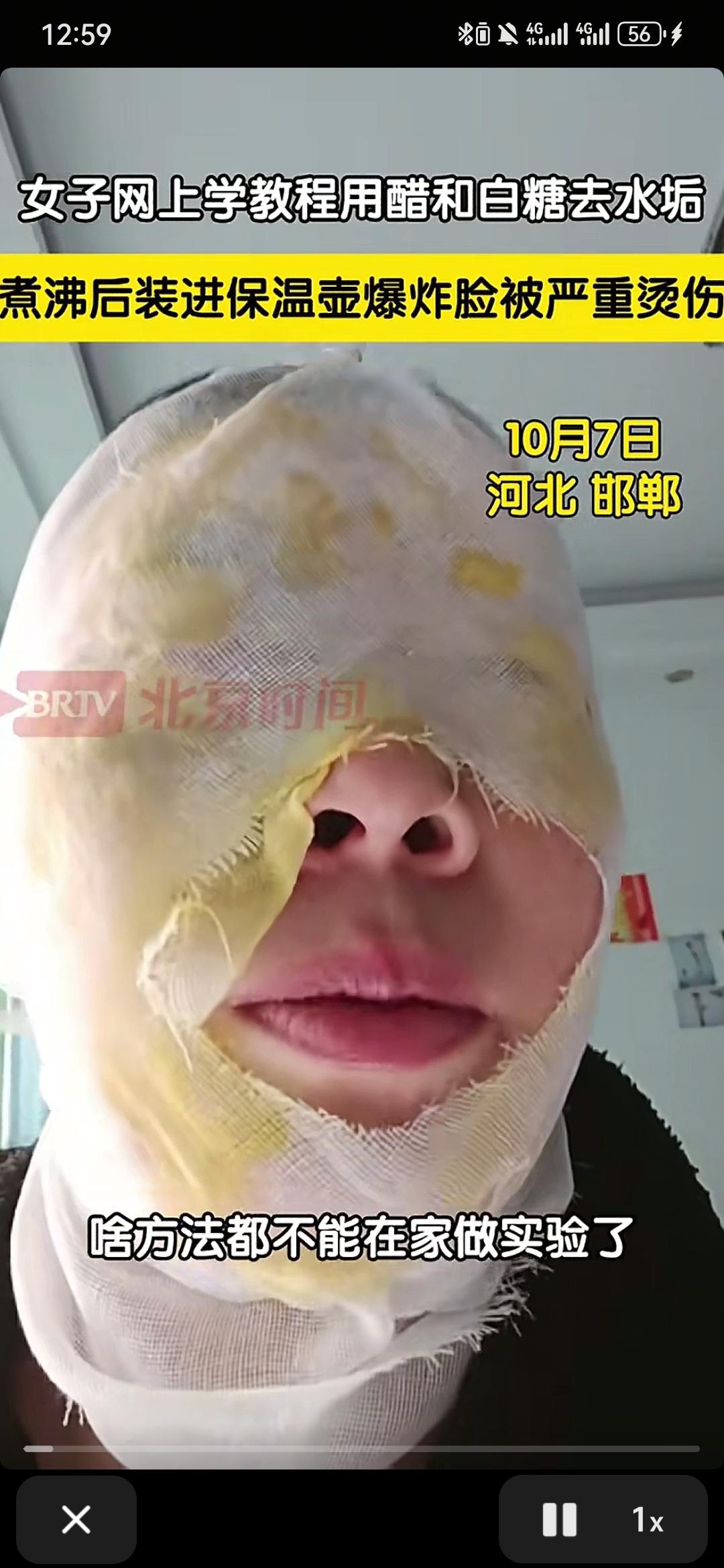 女子学网上“去水垢”教程 不慎爆炸,脸部烫伤 河北一女子因为水壶里面有水垢,于是便学网上的“去水垢”方法。 吴女士将醋和白糖倒进烧水壶,烧开有一分钟过后去查看还有没有水垢,突然间爆炸,面部被烫伤,皮肤大面积脱落。 平时在网上看到此类的视频,要谨慎辨别,可以多渠道查一查,不能只看一个就轻信。