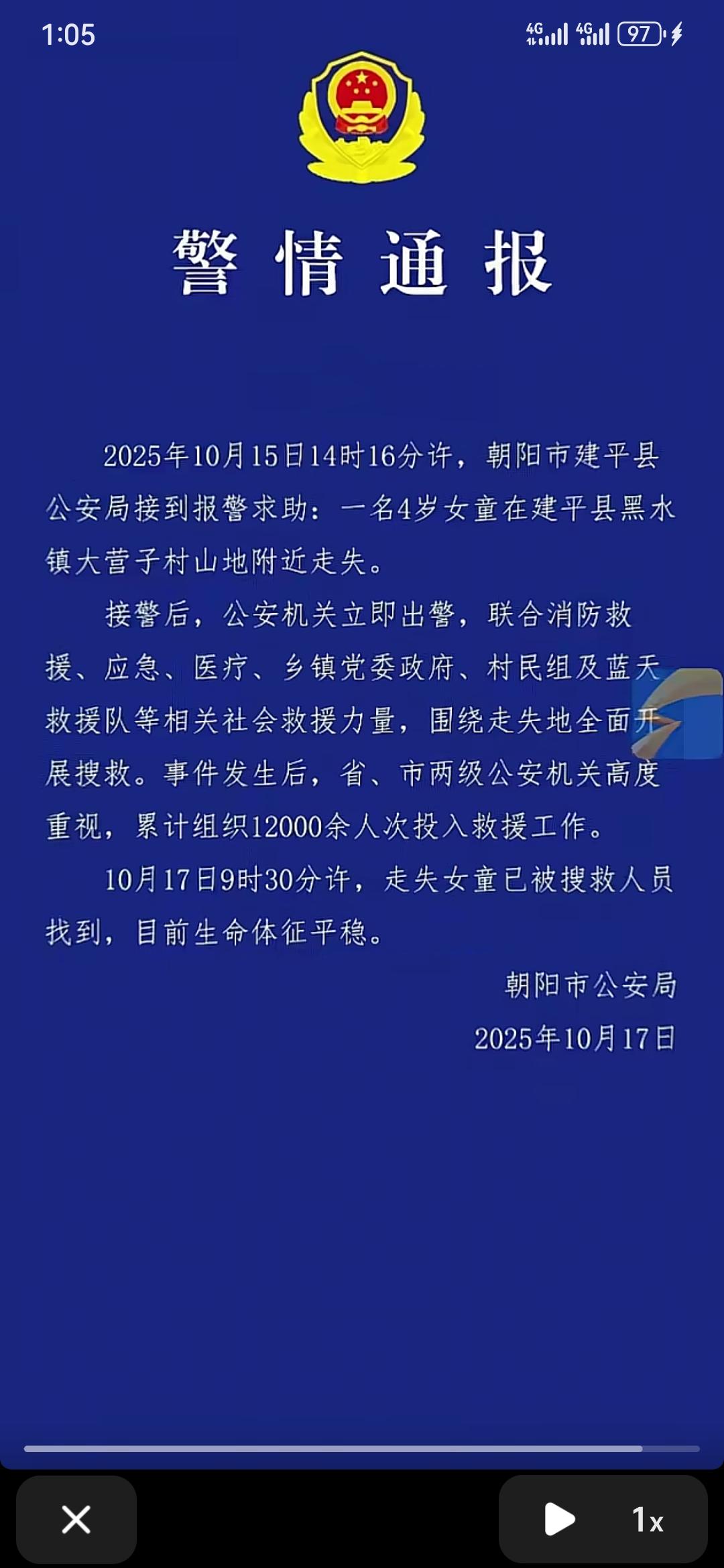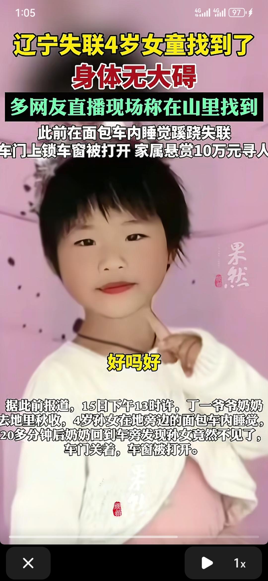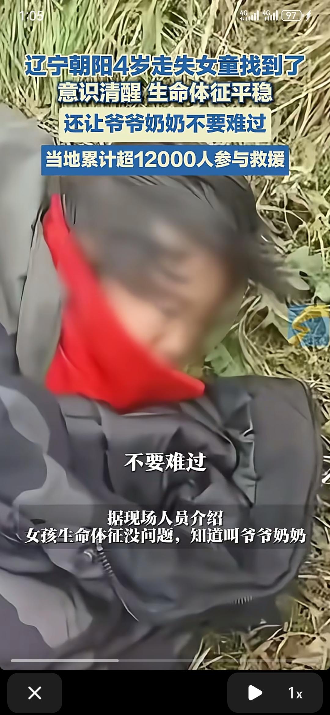 辽宁4岁走失的女孩 打小就聪明,前途不可限量 首先的好消息是经过两天时间,这个女孩已经被找到了 那为什么说这个女孩很聪慧、未来可期呢?依我看,有以下几点: 一、这几天,现在北方气温已经很低了,多地甚至开始下雪了。就还在走丢后,当地甚至开始下雨,气温更低,她自己知道去找个山洞躲着,才4岁的小孩,就能靠周围环境解决自己的困境,看得出来很聪明 二、女孩的顽强意志。气温低、没食物,女孩凭借顽强的意志,支撑到人们找到她,这份意志,是她人生路上的永不磨灭的力量 三、女孩被找到后,还在让爷爷奶奶不要难过,自己都虚弱成那样了,还是考虑到爷爷奶奶,很有孝心,心地善良