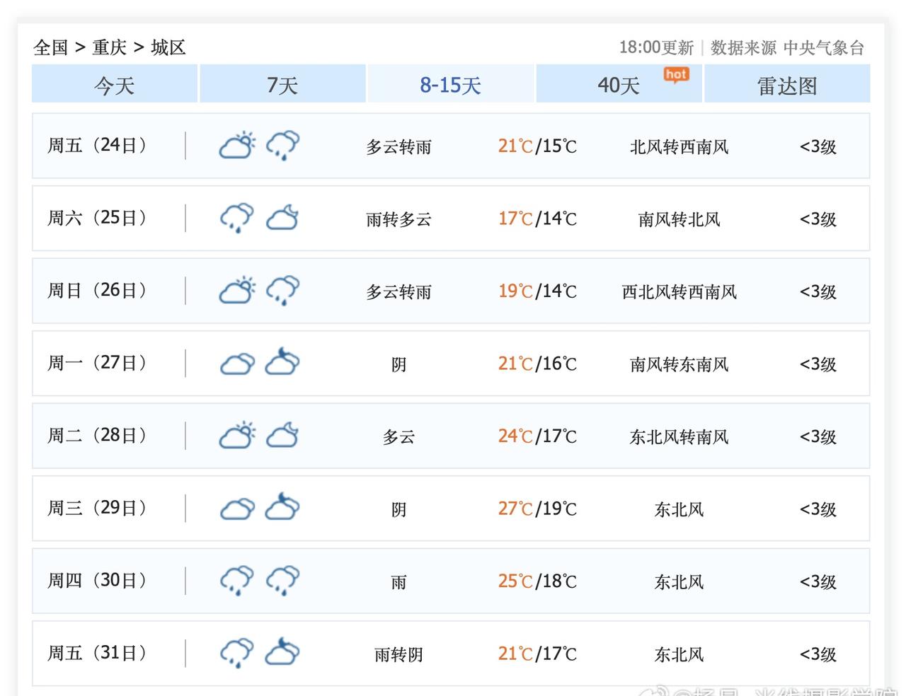 重庆的太阳,终于要持久回来啦!10月21日到28日,重庆主城区,多云晴好为主,少雨……这一轮华西秋雨即将结束啦!哈哈哈! 10月21日到28日,川西也会迎来最美的秋天秋色,红叶秋叶……重庆人,成都人,到时候,去川西318国道川藏线看看秋天吧!九寨沟,毕棚沟,四姑娘山,新都桥,塔公,丹巴……太美了!