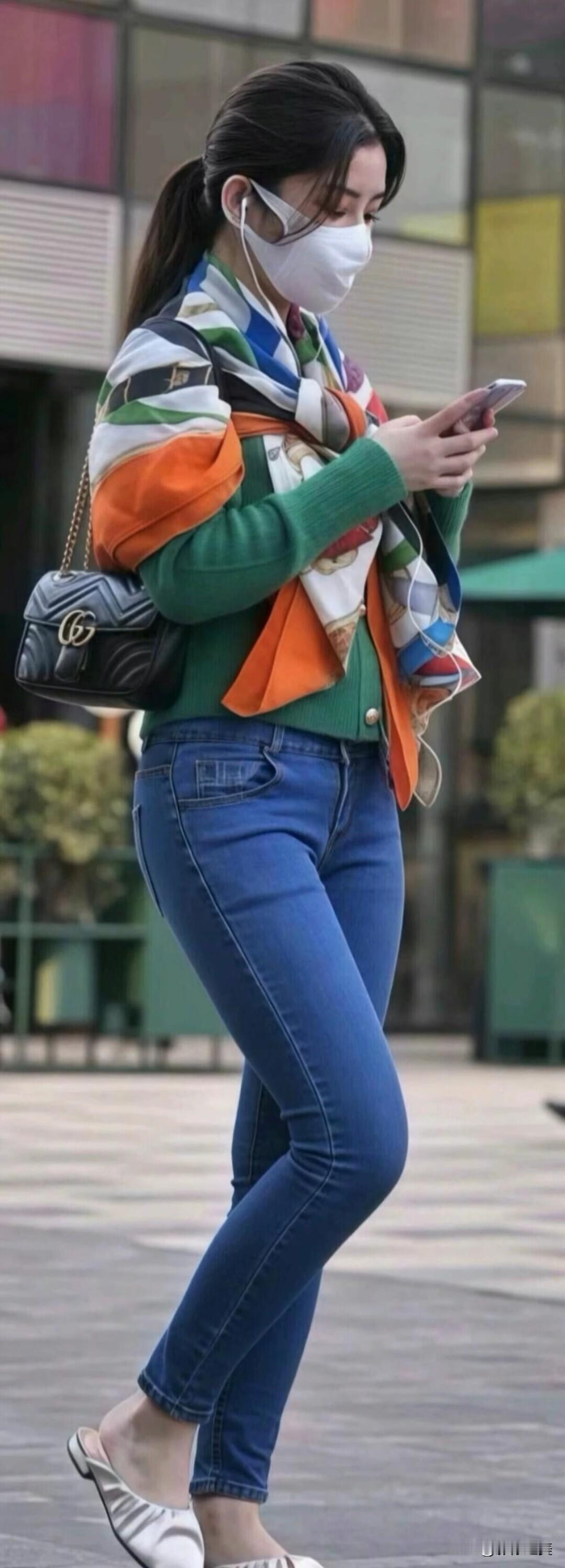 绿色针织衫搭配彩色丝巾,活力又吸睛!蓝色牛仔裤与缎面拖鞋适配日常,是街头的时尚休