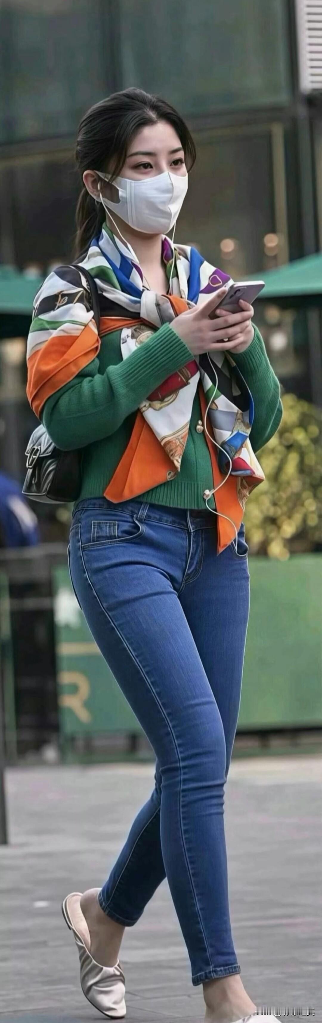 绿色针织衫搭配彩色丝巾,活力又吸睛!蓝色牛仔裤与缎面拖鞋适配日常,是街头的时尚休闲风达人~