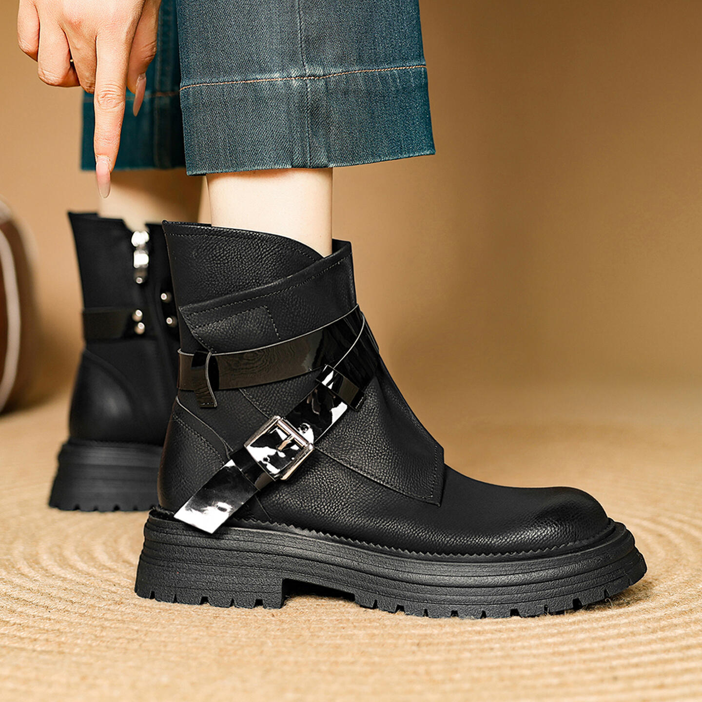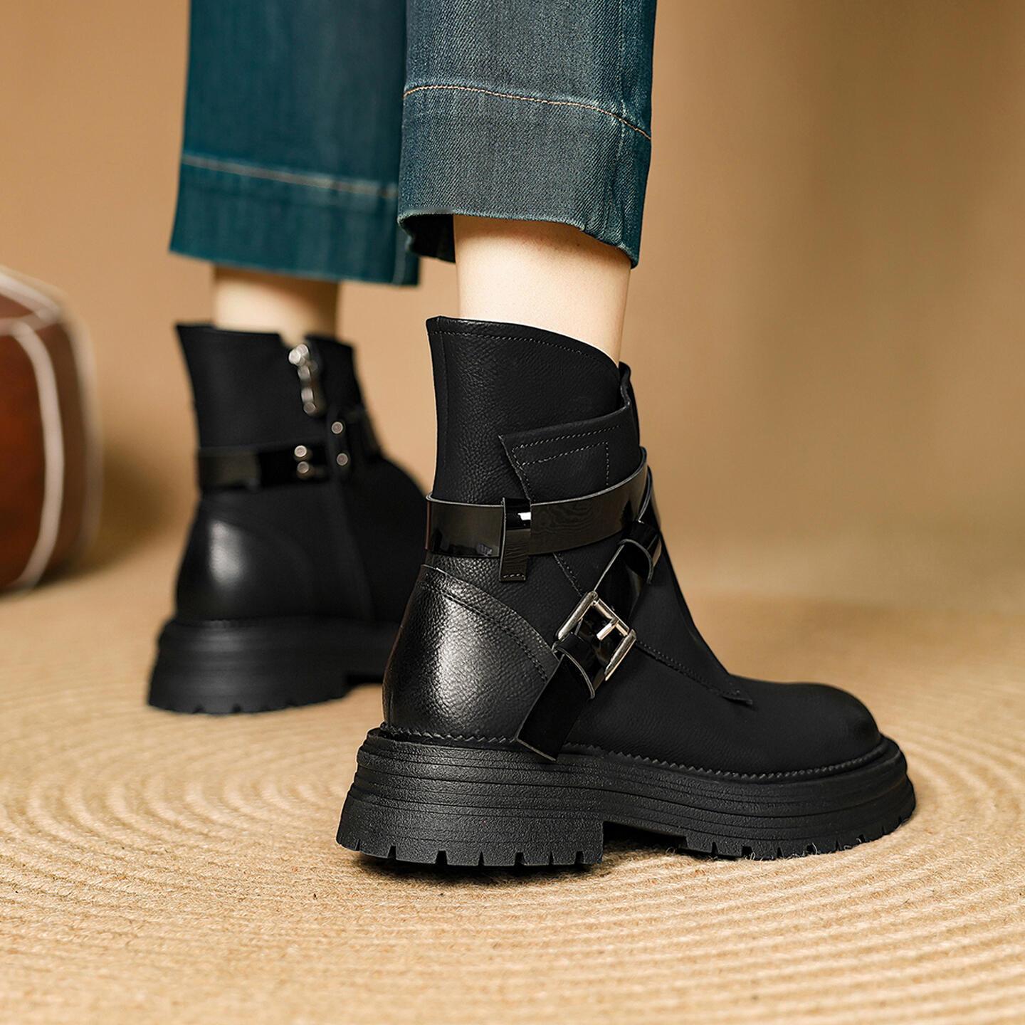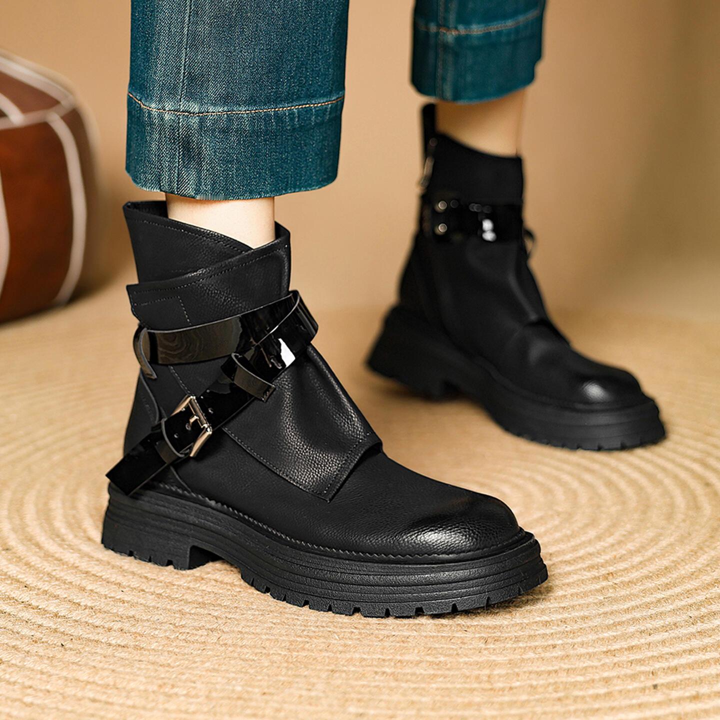 这款短靴太好看了吧,把复古与酷感拿捏得刚刚好,哑光牛皮衬着漆皮扣带,金属搭扣添了利落细节,厚底既拉长比例又带点工装的松弛感。靴型适配卷边裤、短裙等多种穿搭,脚感软弹兼顾支撑性,通勤逛街都能踩出随性时髦。