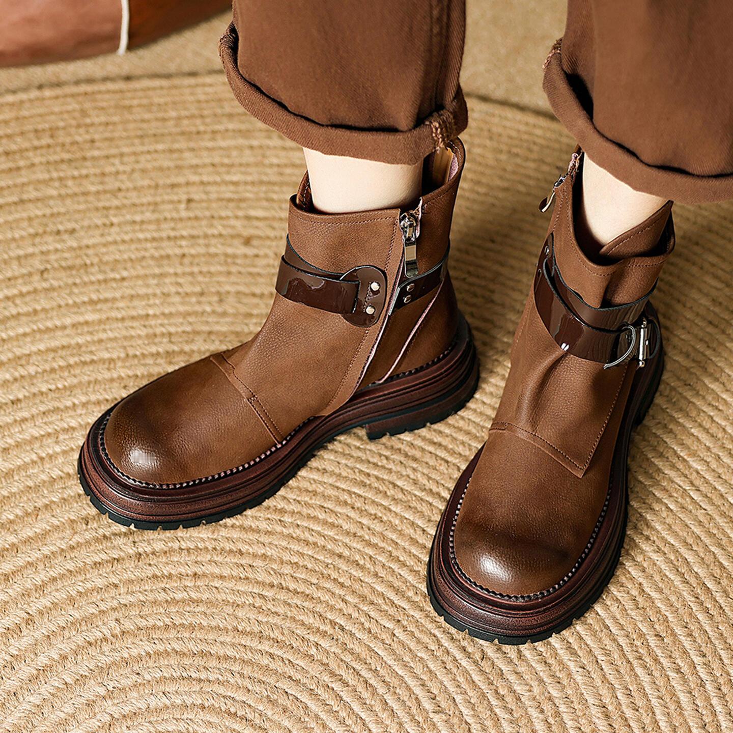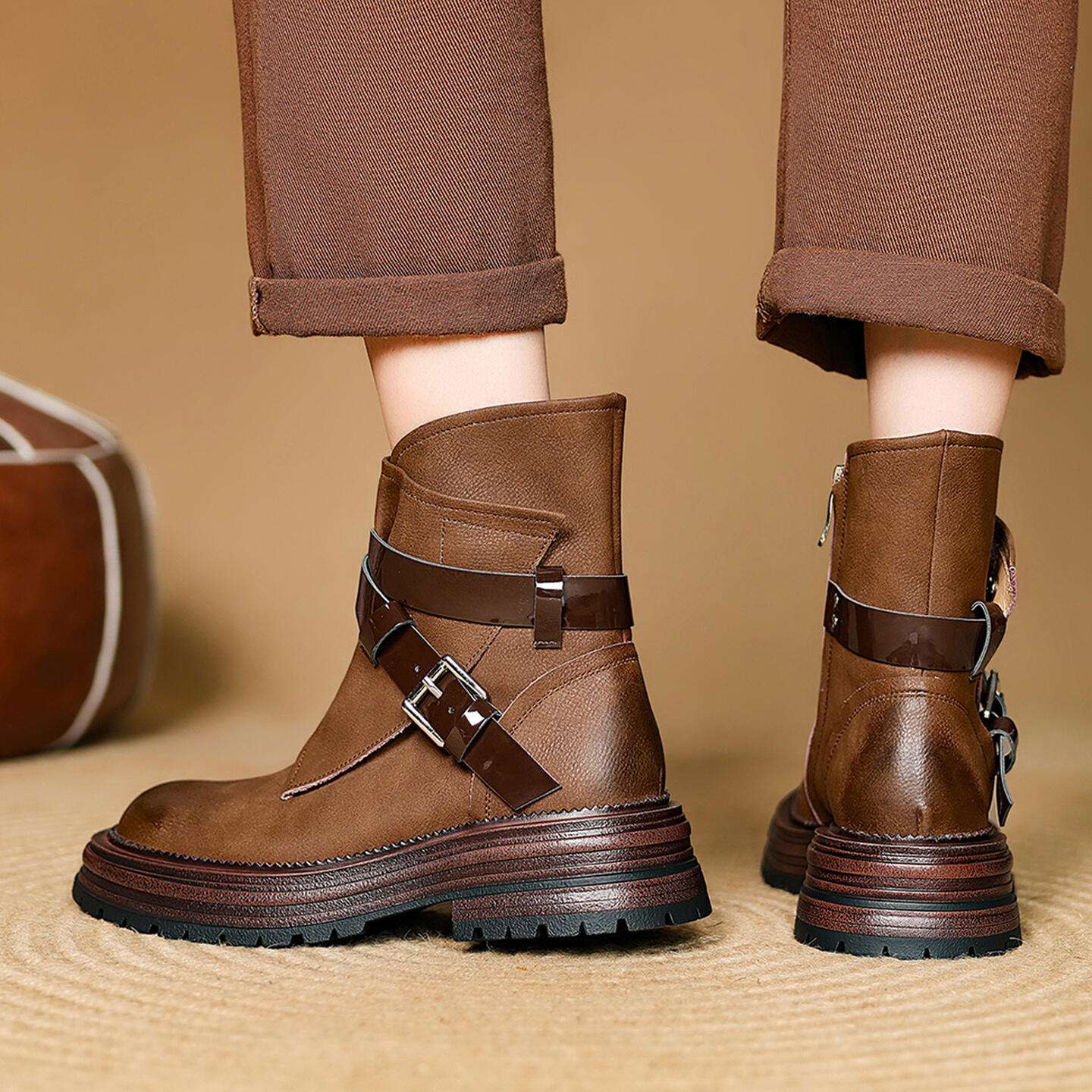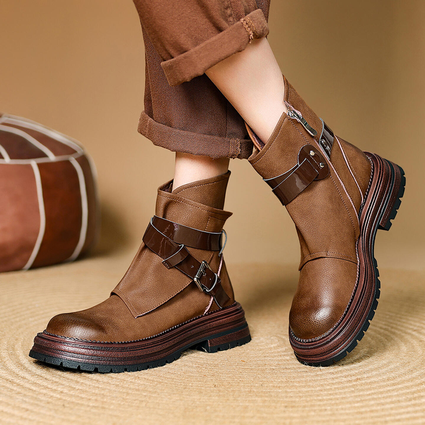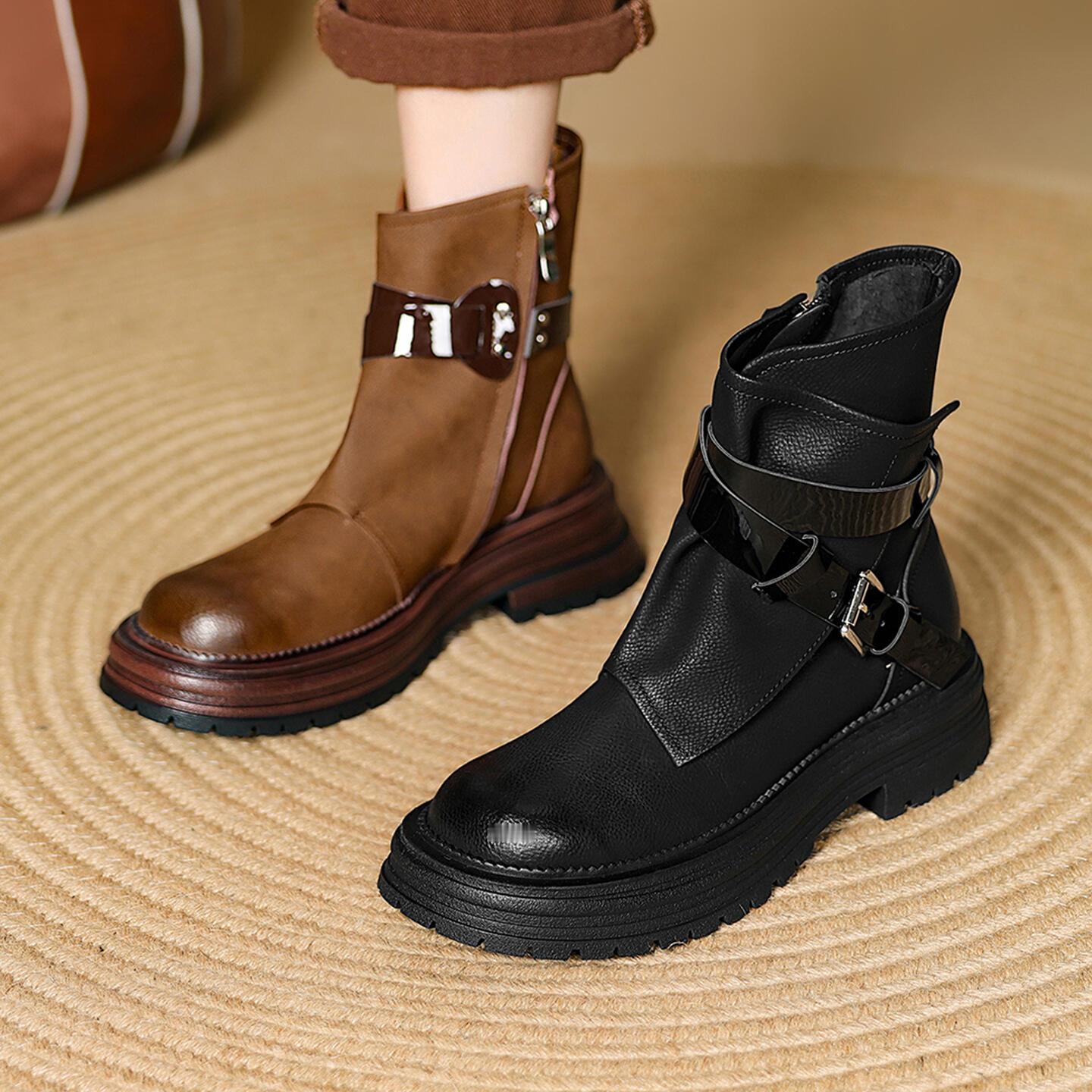 这款短靴太好看了吧,把复古与酷感拿捏得刚刚好,哑光牛皮衬着漆皮扣带,金属搭扣添了利落细节,厚底既拉长比例又带点工装的松弛感。靴型适配卷边裤、短裙等多种穿搭,脚感软弹兼顾支撑性,通勤逛街都能踩出随性时髦。
