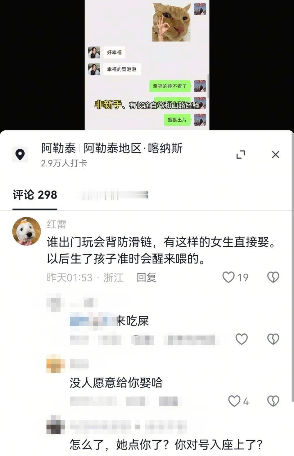前因是两个女生自驾喀纳斯,从北京背了车胎防滑链到新疆,于是就有人👇(还好回复他的都是正常人)