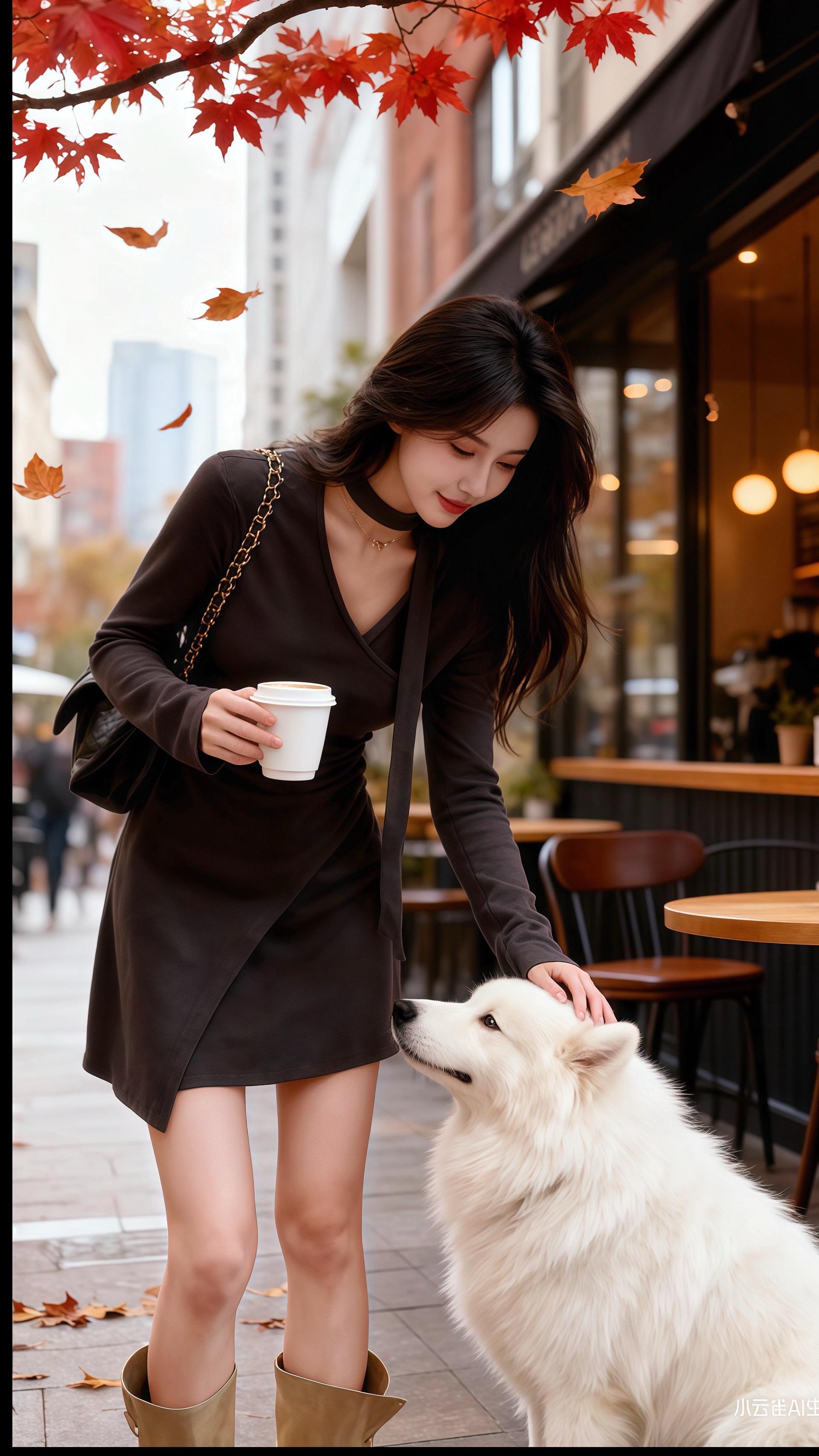 秋日的枫叶红得热烈,许妍穿着深棕连衣裙,搭配卡其色短靴,在街角咖啡店旁逗着一只萨摩耶。