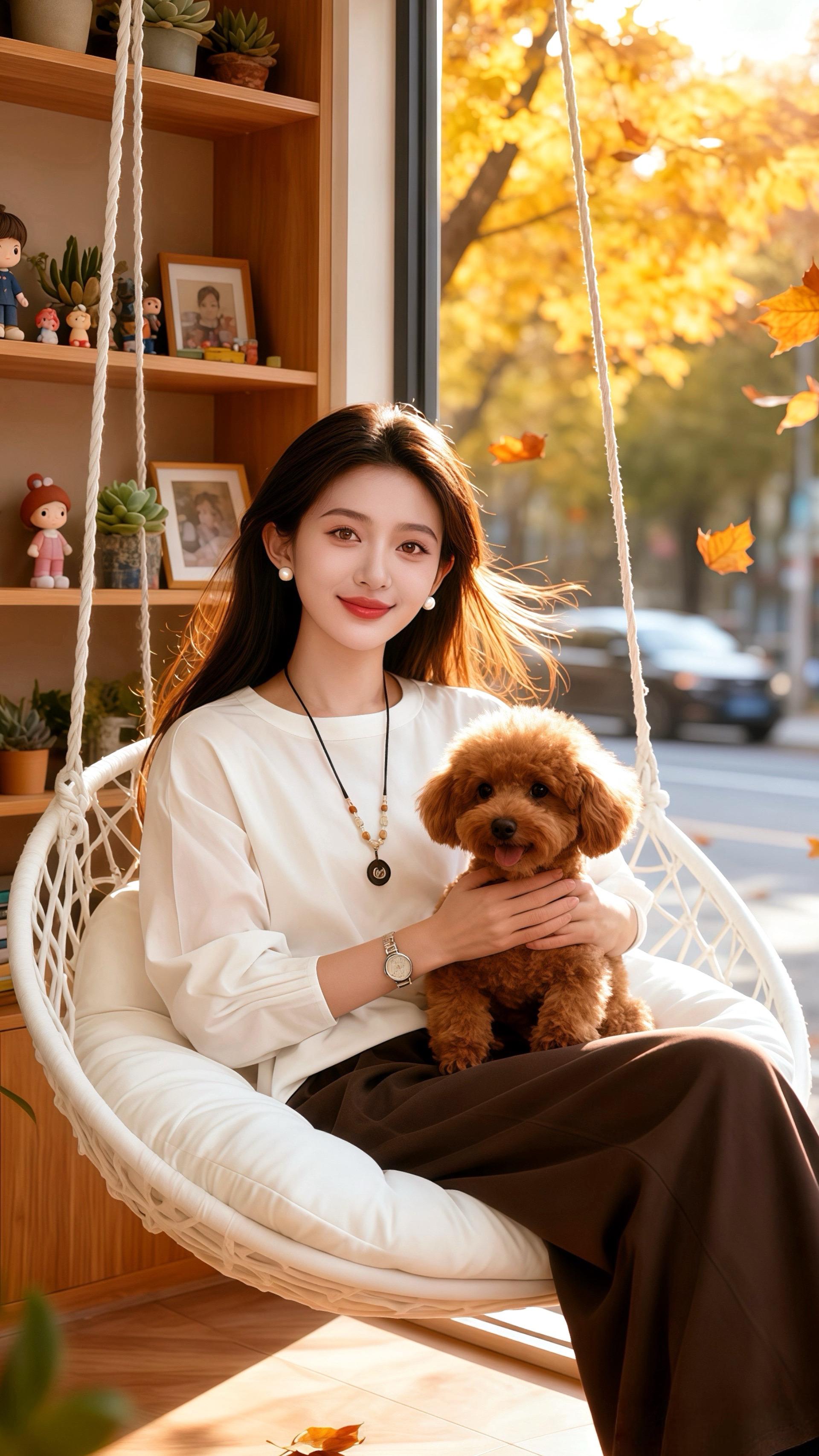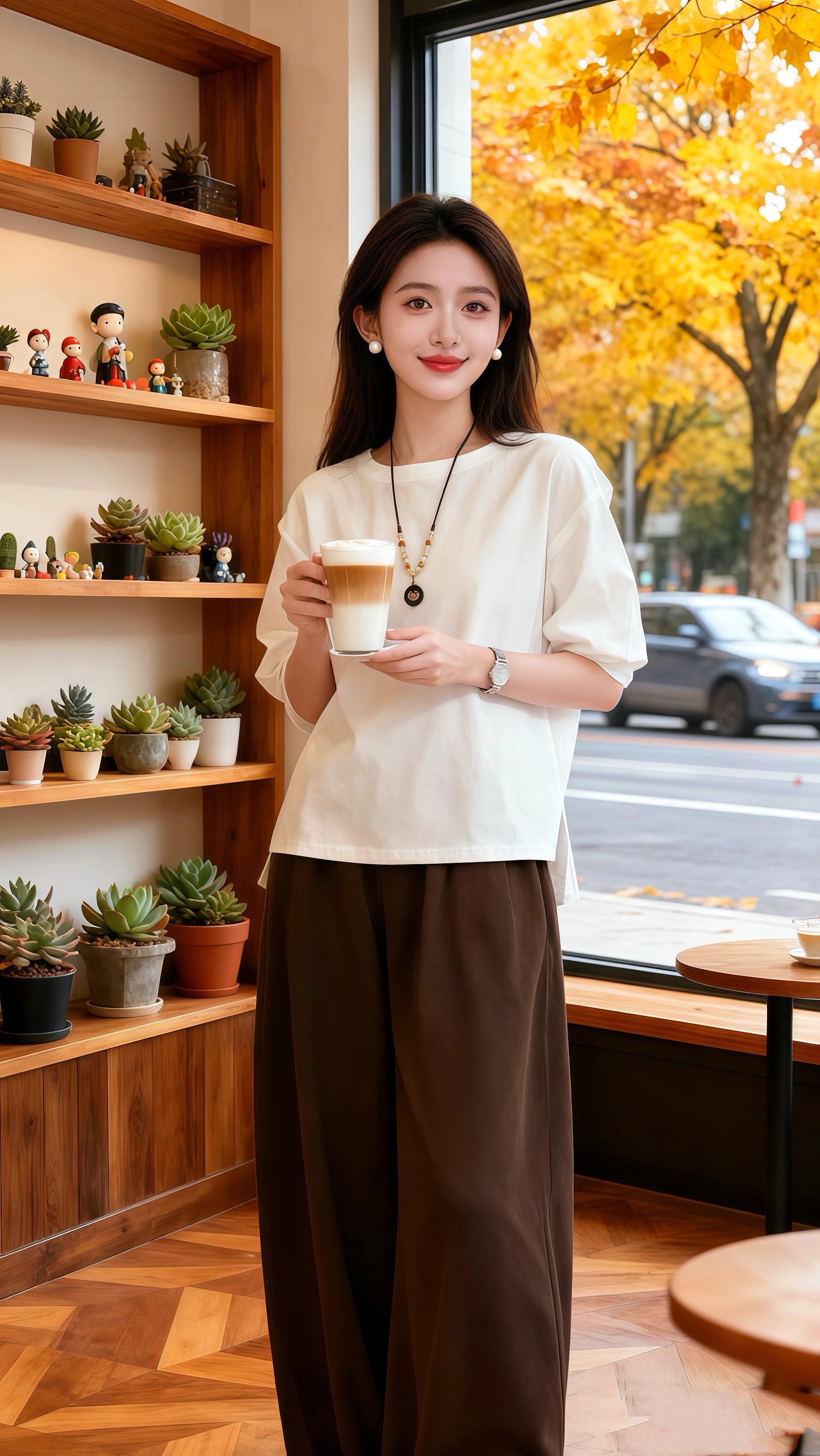 她来到常去的那家咖啡店,暖光下的多肉和秋日街景让她渐渐平静。她开始重新规划,像打理那些多肉一样,耐心培育新的事业。从清晨在窗边抱着书学习,到在吊篮里和小狗分享新的灵感,她一步一步走出阴霾。如今,她的工作室蒸蒸日上,这套衣服见证了她从迷茫到笃定的蜕变,也告诉每一个人:低谷只是暂时的,只要愿意出发,美好终会在前方等候。