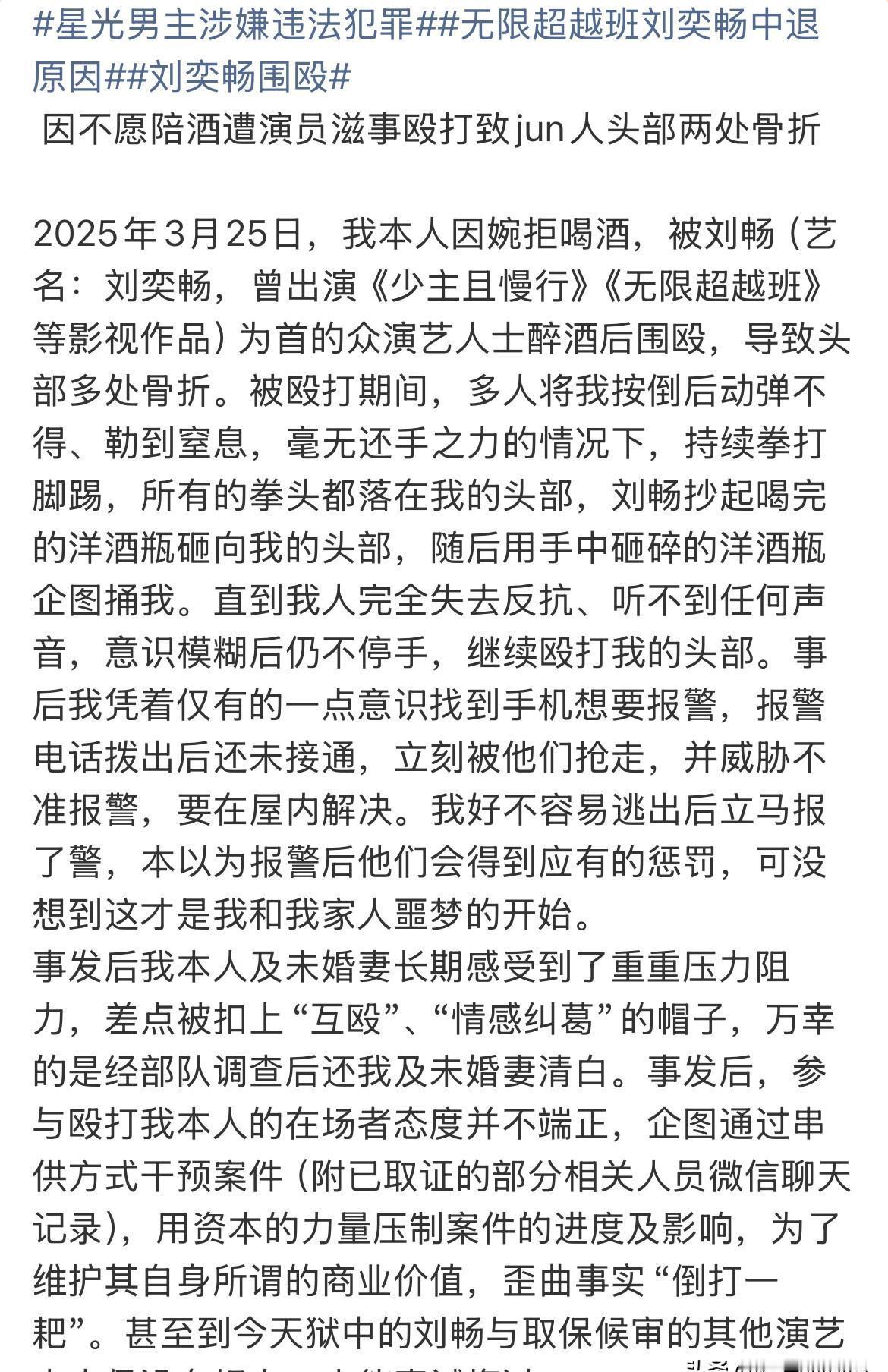 KTV里喝高了动手,刘奕畅摊上事儿了。 不是“围殴”,是推搡,警方笔录写得清清楚楚。 网传视频是旧料拼接,平台已封号辟谣。 这事爆得快,塌得也快。 一开始满屏“艺人带人打素人”,情绪拉满,键盘都敲冒烟了。 结果警方通报一出,调子立马变了味——没视频、没多人动手、没刑事立案,连伤情都是“软组织挫伤”。 刘奕畅工作室也没硬刚,直接认错道歉,愿意赔医药费。 态度摆在这儿,比那些装死的强。 但别急着洗白。 酒局上言语失当、动手推人,哪怕没打成重伤,也是成年人不该干的蠢事。 公众人物喝到失态,本身就是失格。 更别说KTV这种封闭场合,普通人面对几个壮汉围上来,吓都吓懵了,哪敢还手? 一句“推搡”轻描淡写,可对当事人来说,那一分钟可能像一辈子。 现在关键看后续。 伤情鉴定结果、监控调没调、对方要不要追责——这些才是定性的硬杠杠。 别让热度一过,事儿就烂尾。 公众不是非要他社死,但得有个交代:酒不是免罪金牌,名气更不是护体神功。 真要混圈子,先学会管住手、管住嘴。