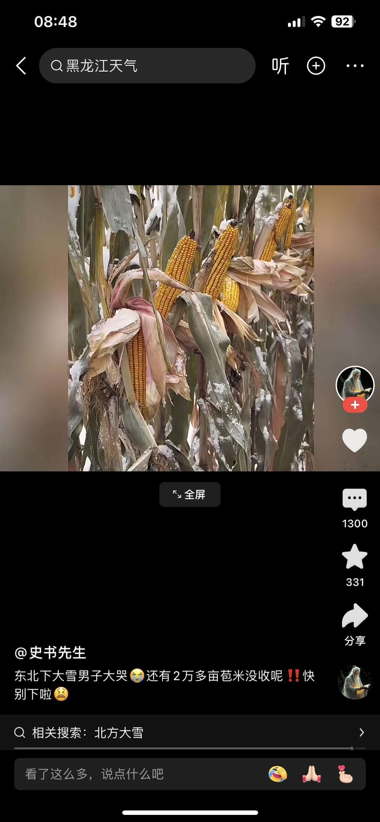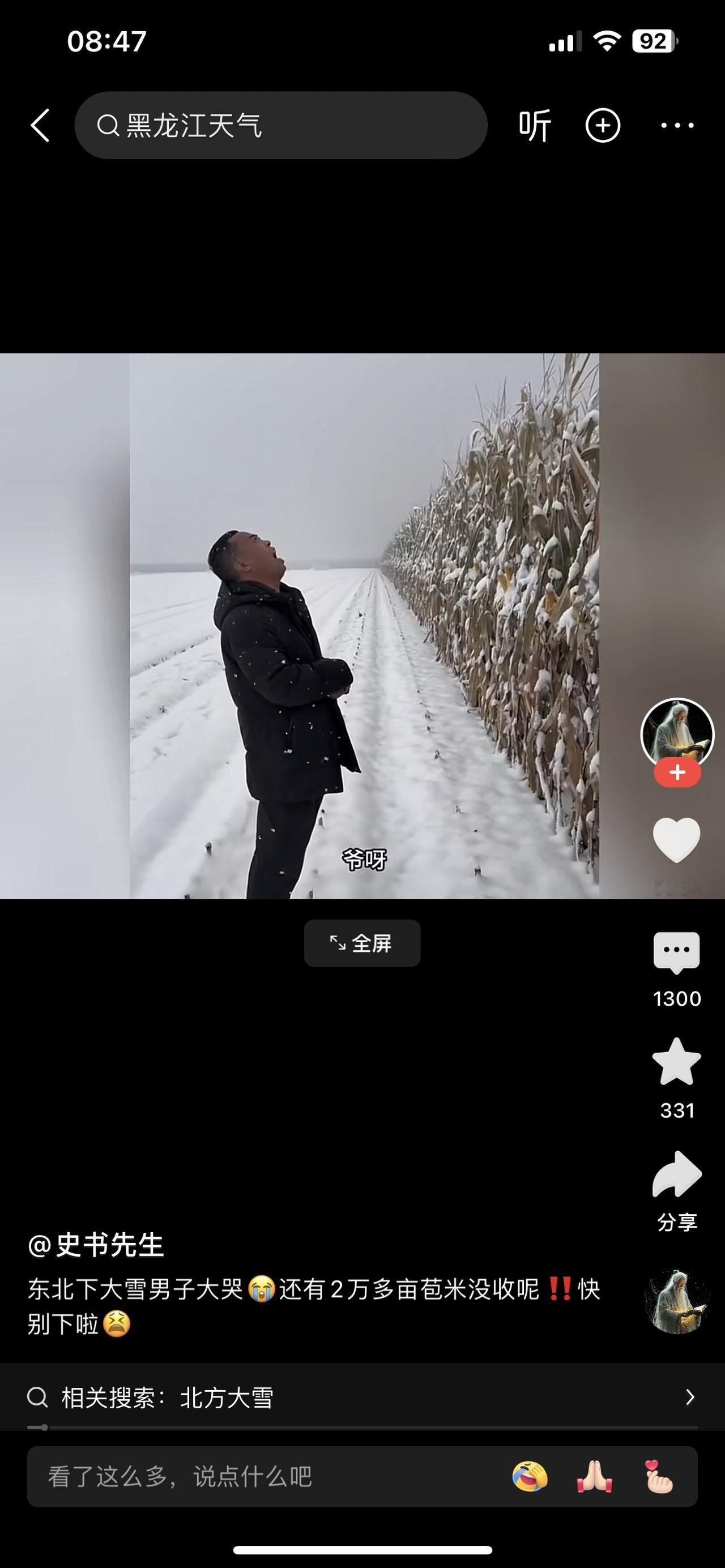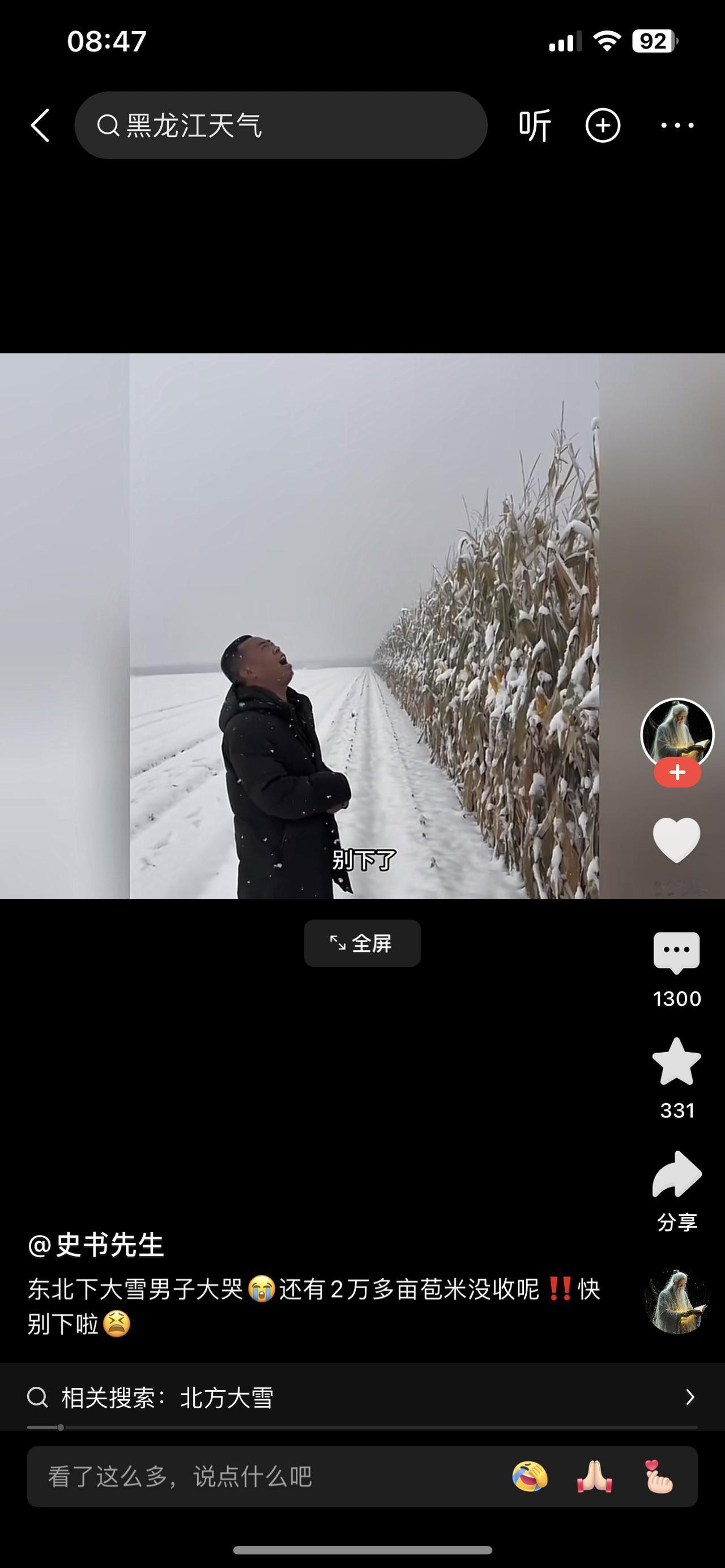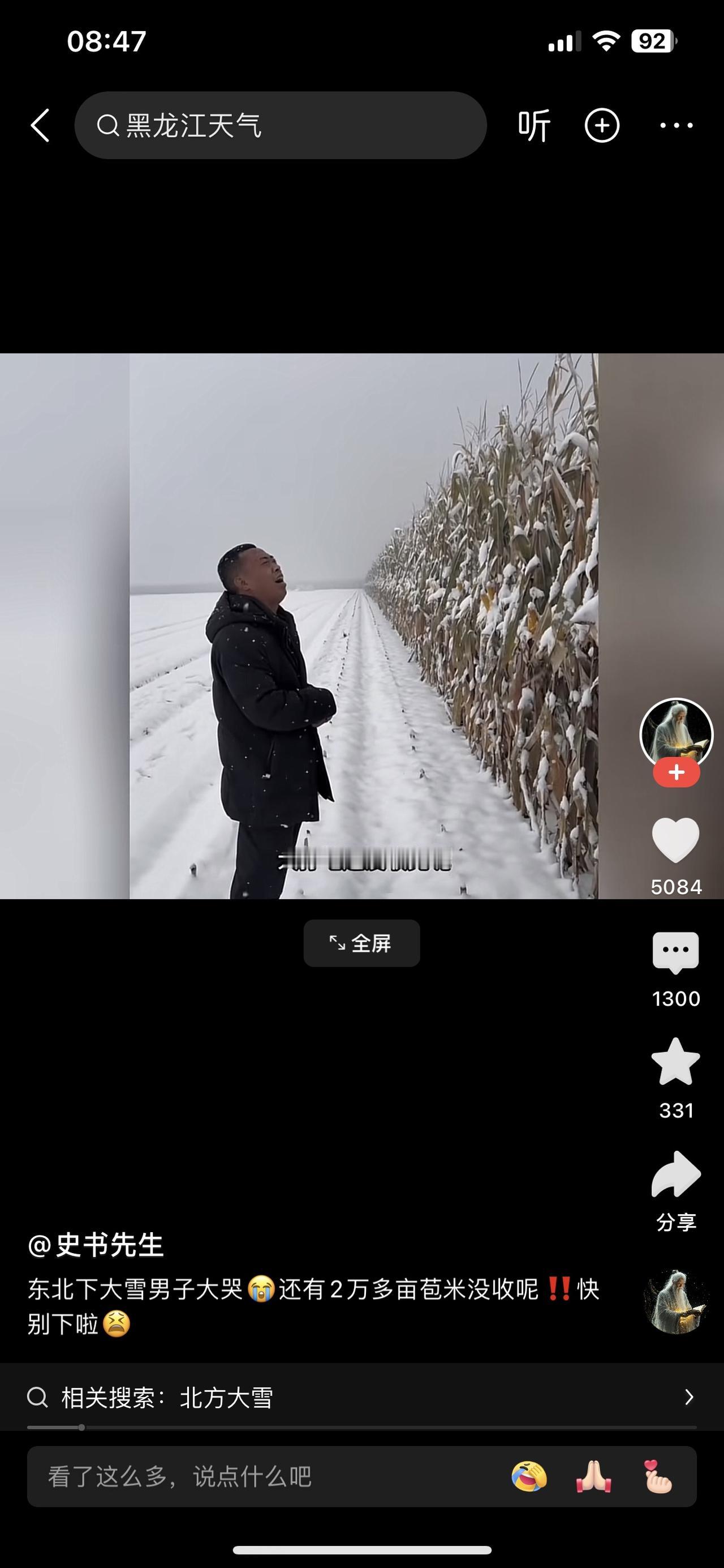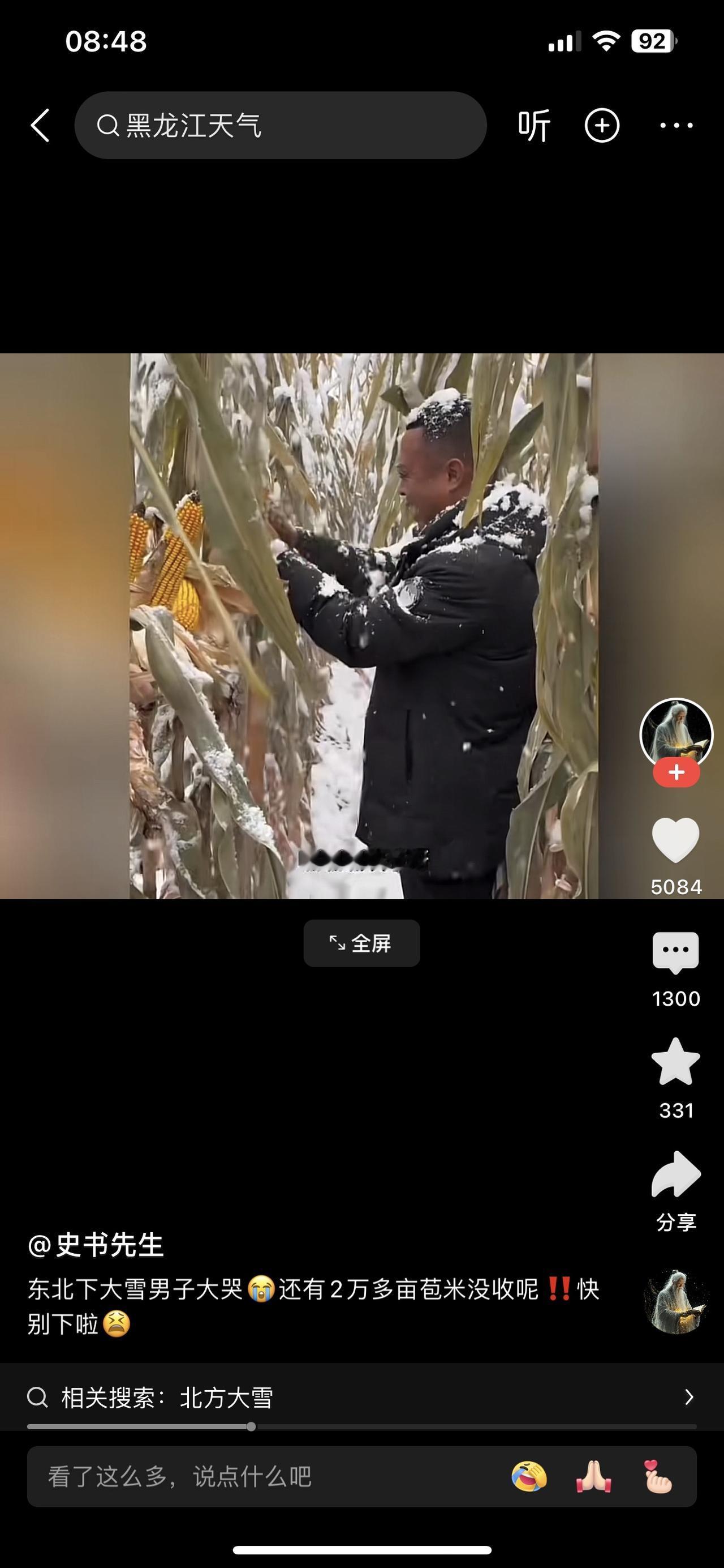 东北下大雪,男子大哭😭还有2万多亩苞米没收呢…… 雪下得又急又大,没半天就把地里的苞米秆埋了半截。男子站在田埂上,看着白茫茫的一片,眼泪顺着冻红的脸颊往下掉,手里的镰刀攥得发白。 旁边邻居劝他“别着急,等雪停了找收割机来”,可他知道,雪一化地里就会结冰,苞米在雪地里泡久了会发芽,一年的收成就毁了。 村里不少人种苞米,这场雪来得比往年早,好多人家都没来得及收。有人试着用铲车清雪,可雪太厚,铲车陷在地里动弹不得。 后来镇里知道了这事,派来几台大型清雪机,还组织志愿者帮忙。大家顶着寒风,一边清雪一边掰苞米,手冻得没知觉就哈口气搓一搓。 过了三天,大部分苞米终于收完了。男子看着堆在院子里的苞米,红着眼眶给大家递热水,嘴里不停地说“谢谢,要是没有你们,我真不知道该咋办”。东北农村下雪