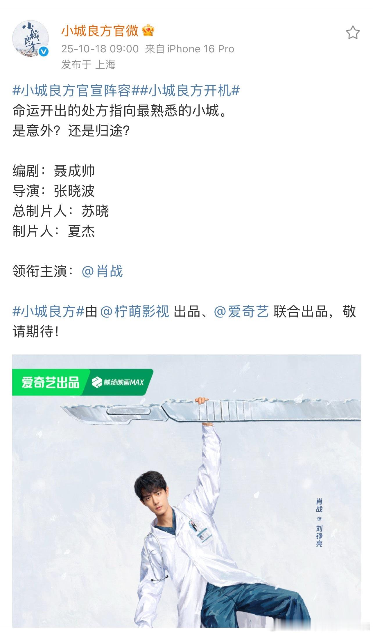 肖战 小城良方官宣开机了!