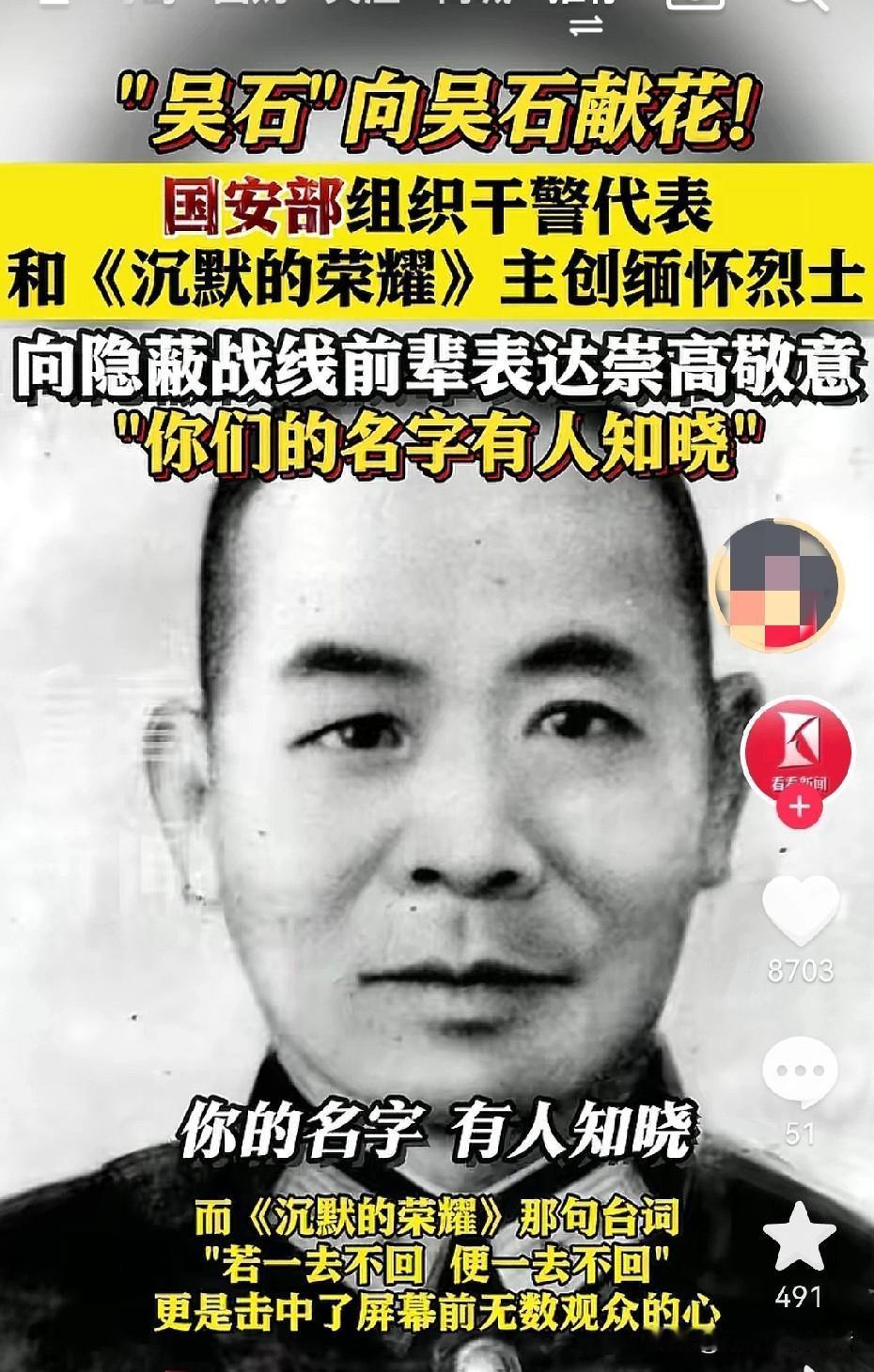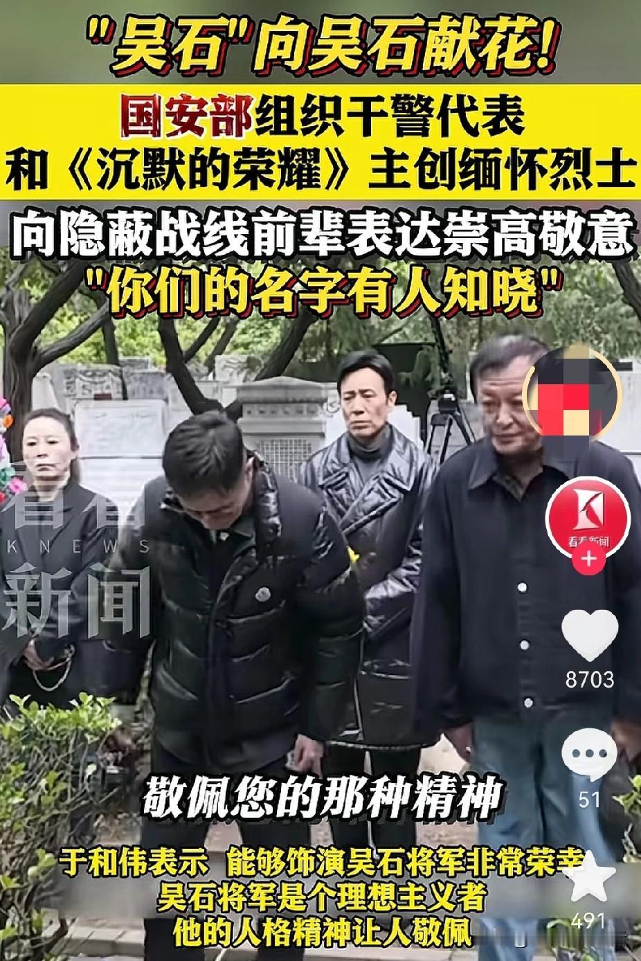 假“吴石”带队向真吴石敬献鲜花! 真假“吴石”隔时空对话! 敬佩吴石将军的人格,敬佩他的那种精神。 也感谢于和伟带我们了解了吴石将军的生平事迹,和他默默的为我们的幸福生活做出的贡献和牺牲,也是他们逼真的演技,完美复刻了人物原型,还原了历史真相,让沉默者也能站在荣耀的前面。 在初看《沉默的荣耀》的时候,一直有一个困惑,在吴石得到金门将有大量增援部队的时候,为了减少不必要的牺牲,冒险和张灏接头,在医院传递消息被特务追捕的时候,张灏为了保住吴石和情报网,甘愿牺牲自己,并把联络方式告诉吴石。 而谷正文作为这次行动的负责人,公然对吴石这个国防次长开枪,已经严重的以下犯上了,还有那个开第一枪的小特务,吴石也只是打伤了他的腿,在他下车后,完全可以把谷正文给灭了,后来也只是在他耳边开了一枪,并没有打死他。 这也成为后面的隐患,谷正文三番五次的调查吴石,多次残害情报人员,也让吴石多次陷入危机中。 就是想不明白为什么没除掉他,包括后面毛人凤道歉,蒋经国出面调解的时候,还有自己的总长领导给出头的时候,都可以借手除掉这个后患,为什么就能那么轻易的放过他呢?甚至连一点处罚都没有呢? 这也是后面给自己和其他情报人员带来无限的危机。 你们有看懂的吗?