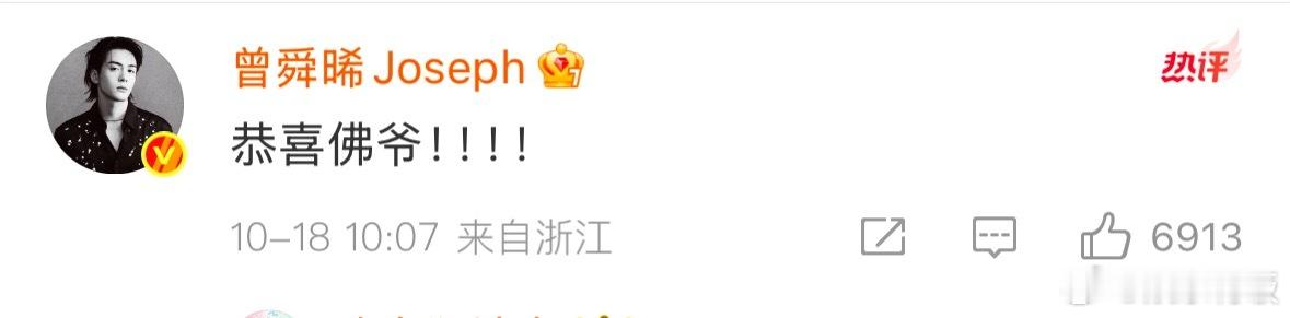曾舜晞恭喜陈伟霆 评论区恭喜陈伟霆:“恭喜佛爷!!”,冲浪好快[送花花]