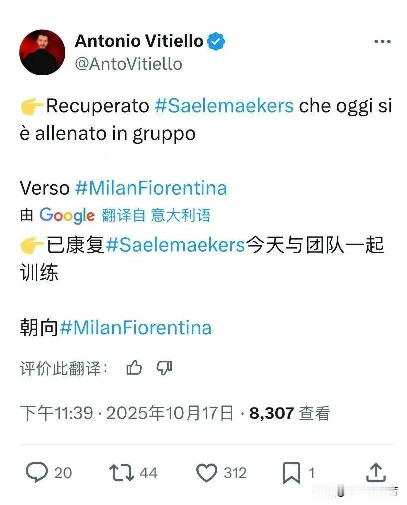 萨勒马克尔斯!米兰中场球员萨勒马克尔斯身体恢复良好,他今天参加了米兰的训练,并且