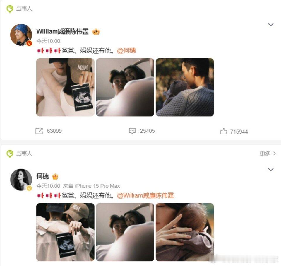 今天上午陈伟霆和何穗官宣生子。简单一句“爸爸、妈妈还有他”直接引.爆.热.搜,合照中宝宝软萌可爱,趴在陈伟霆肩头。