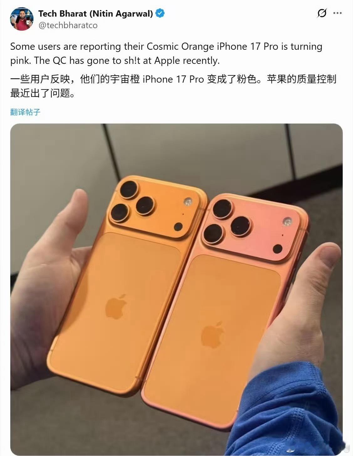 之前就人提出过疑问,iPhone 17 Pro系列的橙色如果长期在户外阳光底下暴晒,有可能出现褪色情况。iPhone17被曝机身褪色