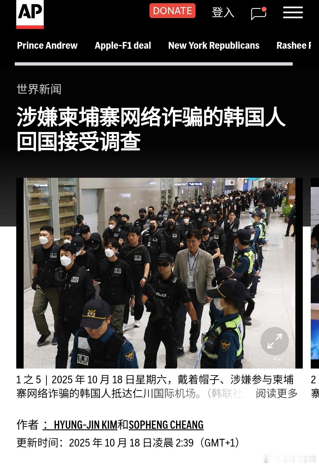 (美联社)——数十名涉嫌参与柬埔寨网络诈骗的韩国人周六乘坐包机抵达韩国接受刑事调查。