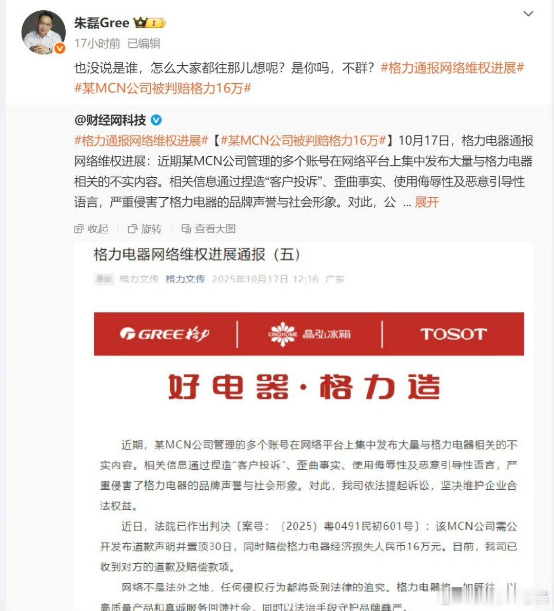 近日,法院已作出判决〔案号:(2025)粤0491民初601号〕:该MCN公司需公开发布道歉声明并置顶30日,同时赔偿格力电器经济损失人民币16万元。目前,公司已收到对方的道歉及赔偿款项。