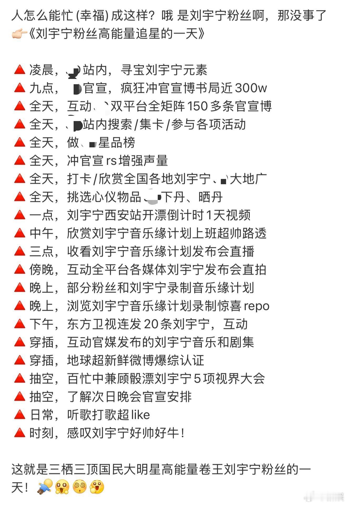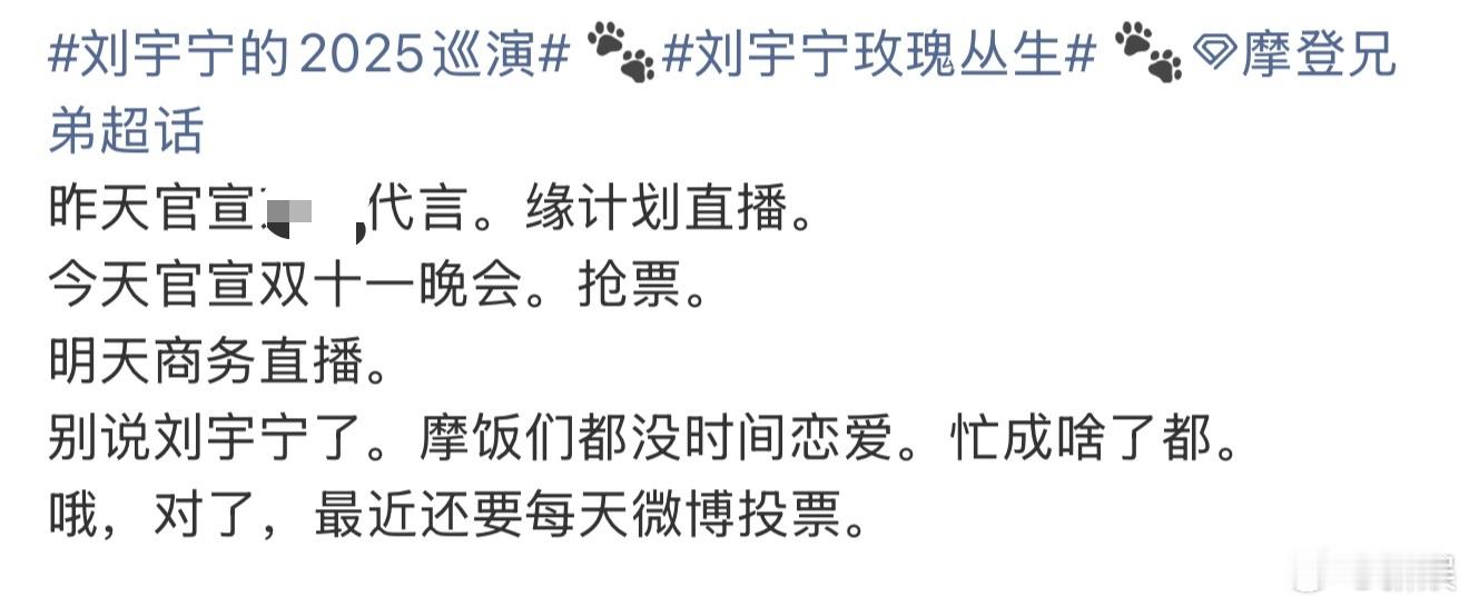 可把刘宇宁粉丝忙坏了 本月最忙粉丝奖颁给摩饭谁赞成谁反对!刘宇宁的粉丝有多忙?不但要追剧、追综艺、听新歌、全国各地追演唱会。官宣了番茄台晚会后更是忙到飞起,各种组团去打卡痛车、大屏甚至飞艇,行程已经从每天精细化到每小时,手心和脚底心都忙到冒火星子了,鸡排哥都没摩饭忙吧[跪了]