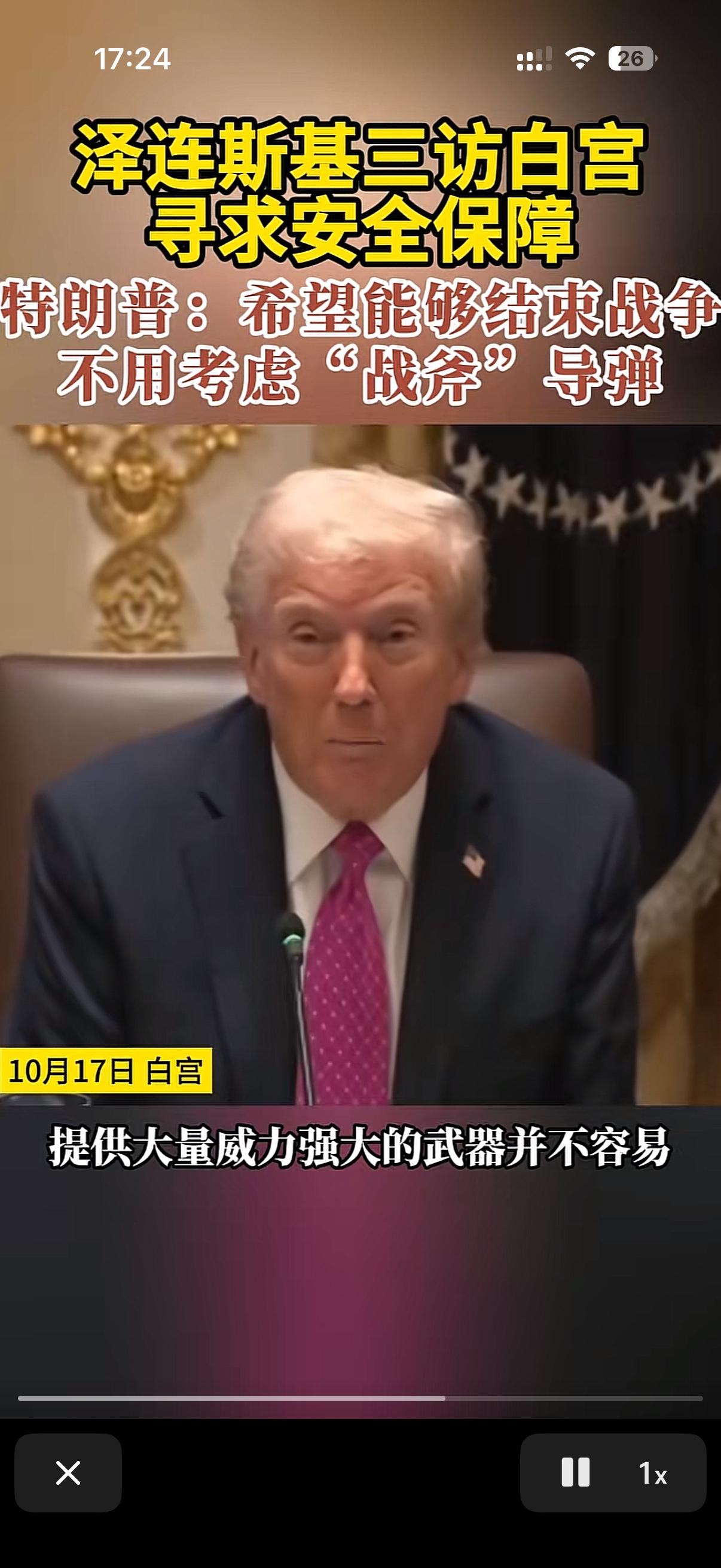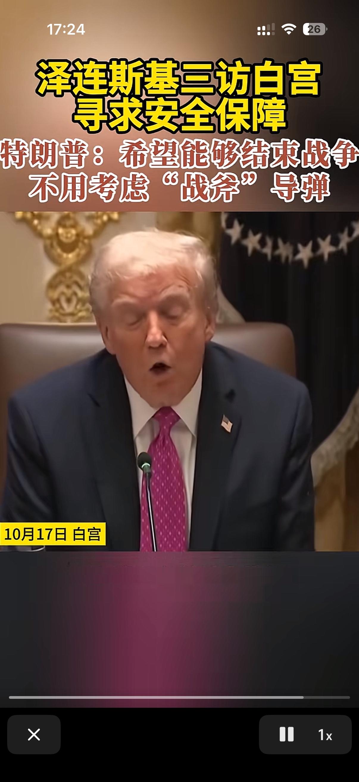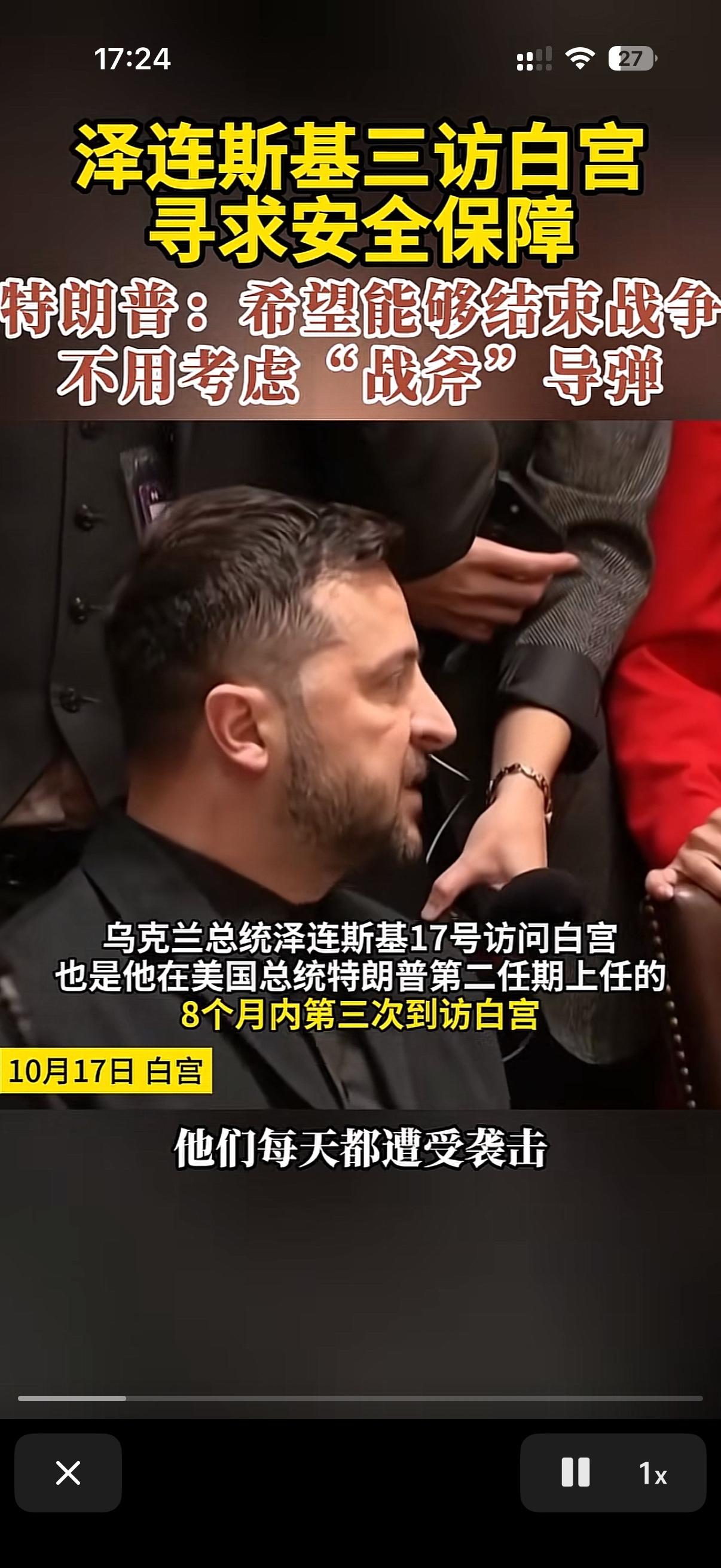 看来泽连斯基这次白宫之行还是无功而返了! 此前特朗普无论是在社交媒体还是新闻讲话上都话里话外的透露出,美国一定会给乌克兰提供战斧导弹。 要知道战斧导弹这种远程武器一直都是大国专有的战略武器是禁止出口的! 此前特朗普和普京见面的时候还打趣问介意美国提供战斧给乌克兰么? 也许正是因为这些消息,所以这次泽连斯基的白宫之行才如此的踌躇满志,可惜见面却让特朗普给了泽连斯基当头一棒,当泽连斯基说乌克兰如何如何的需要战斧导弹来谋求安全的时候,特朗普很明确的拒绝了泽连斯基。 并且特朗普说了乌克兰需要的不是战斧导弹,乌克兰需要的是和平,泽连斯基现在应该回去和俄罗斯好好谈判! 可以说泽连斯基的三次白宫之行两次都被戏耍了!吐槽 聚焦俄罗斯乌克兰局势 乌克兰